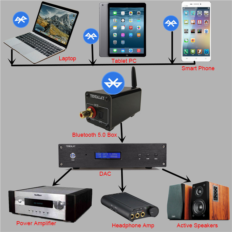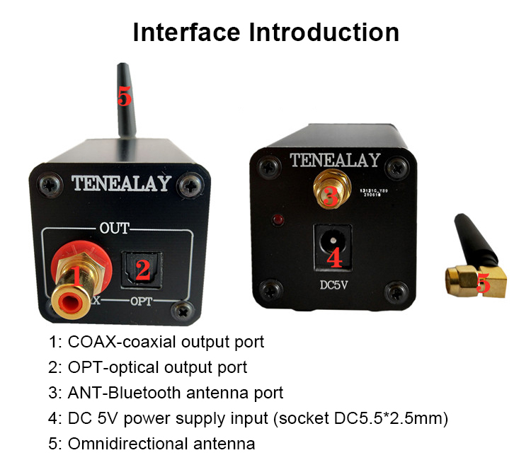 - Usage: After receiving the bluetooth signal sent by your mobile phone, computer and other devices, it directly outputs SPDIF digital coaxial and optical signals. It can be used with all kinds of DAC decoders (mobile phones, tablets, laptop computers - Bluetooth digital players - decoders - power amplifiers - speakers)