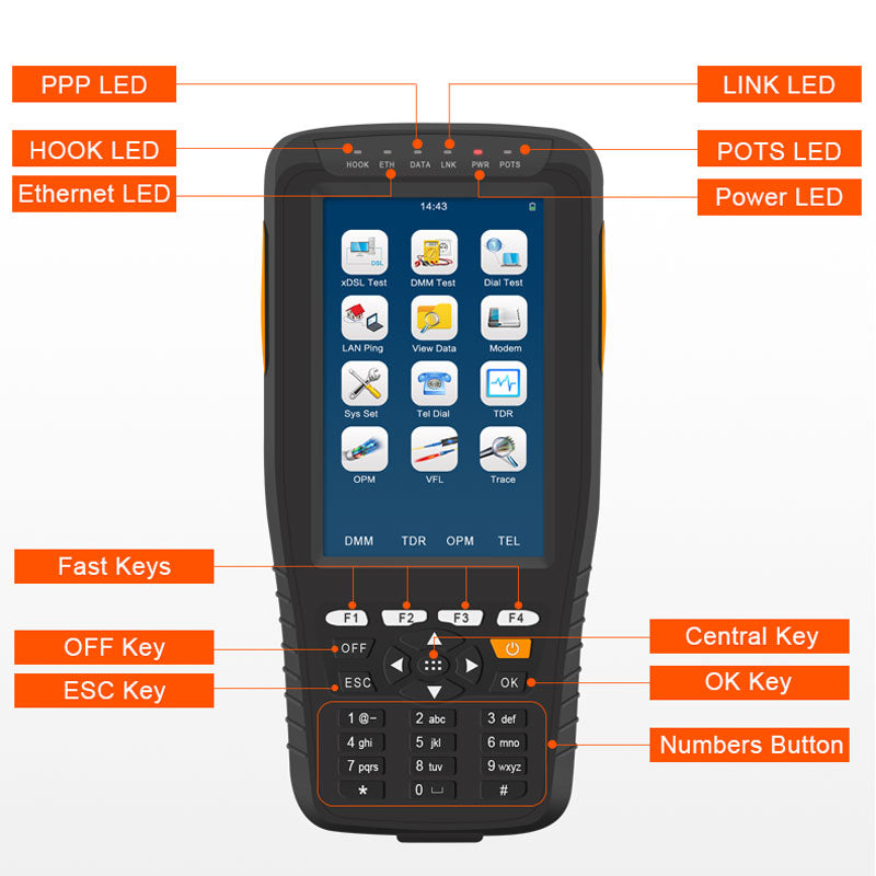 TM-600 VDSL tester specially designed for xDSL line test (xDSL include: ADSL, ADSL2, ADSL2+, READSL, VDSL2 etc.) and maintenance It provides xDSL test, PPPoE dial test, DMM test, Modem emulation, line voltage indication and so on.