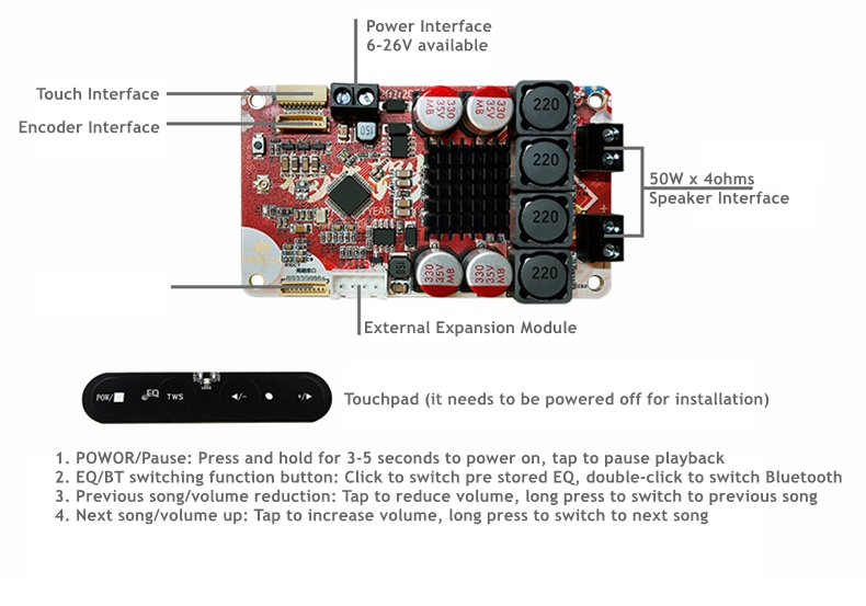 Touchpad+Encoder Version DSP Digital Stereo TPA3126 Super Bass Bluetooth Power Amplifier Board Support for AAC 24Bit Decoding
