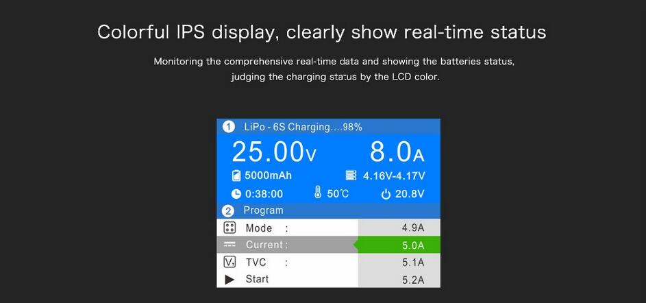 Support Battery Types: LiPo/LiFe/LiHV/LiIo(1-6S); NiMH/NiCd(1-16S); Lead Acid 2V-24V(1-12S)