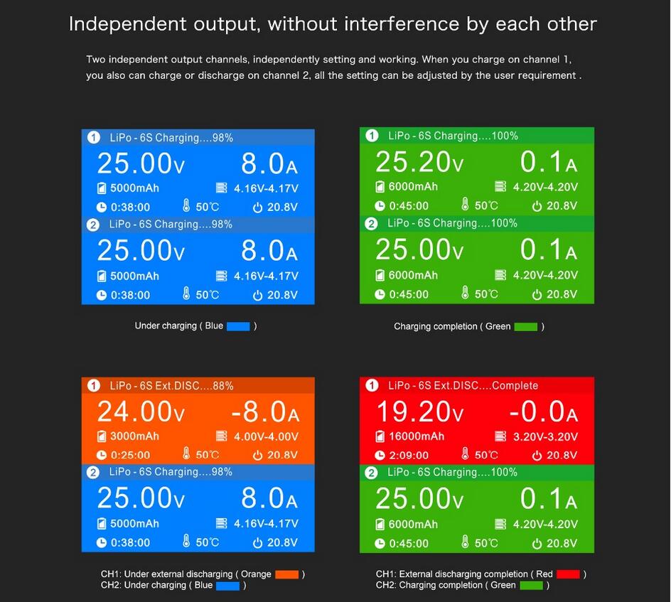 Charge Power: AC 160W(CH1+CH2=160W); DC 2x200W