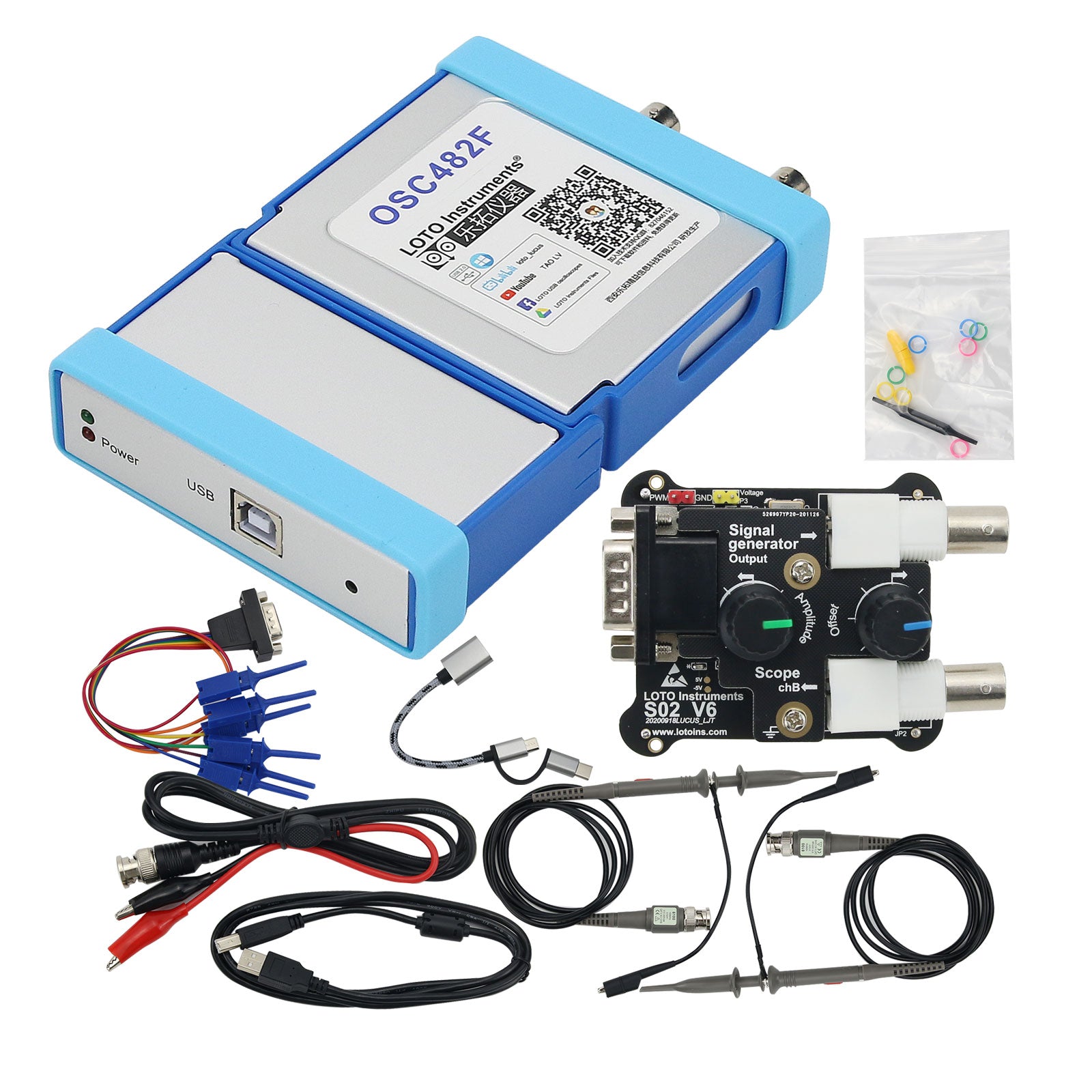 The USB oscilloscope and the required accessories( including extension modules and  standard accessories) may be different according to your different purchase: