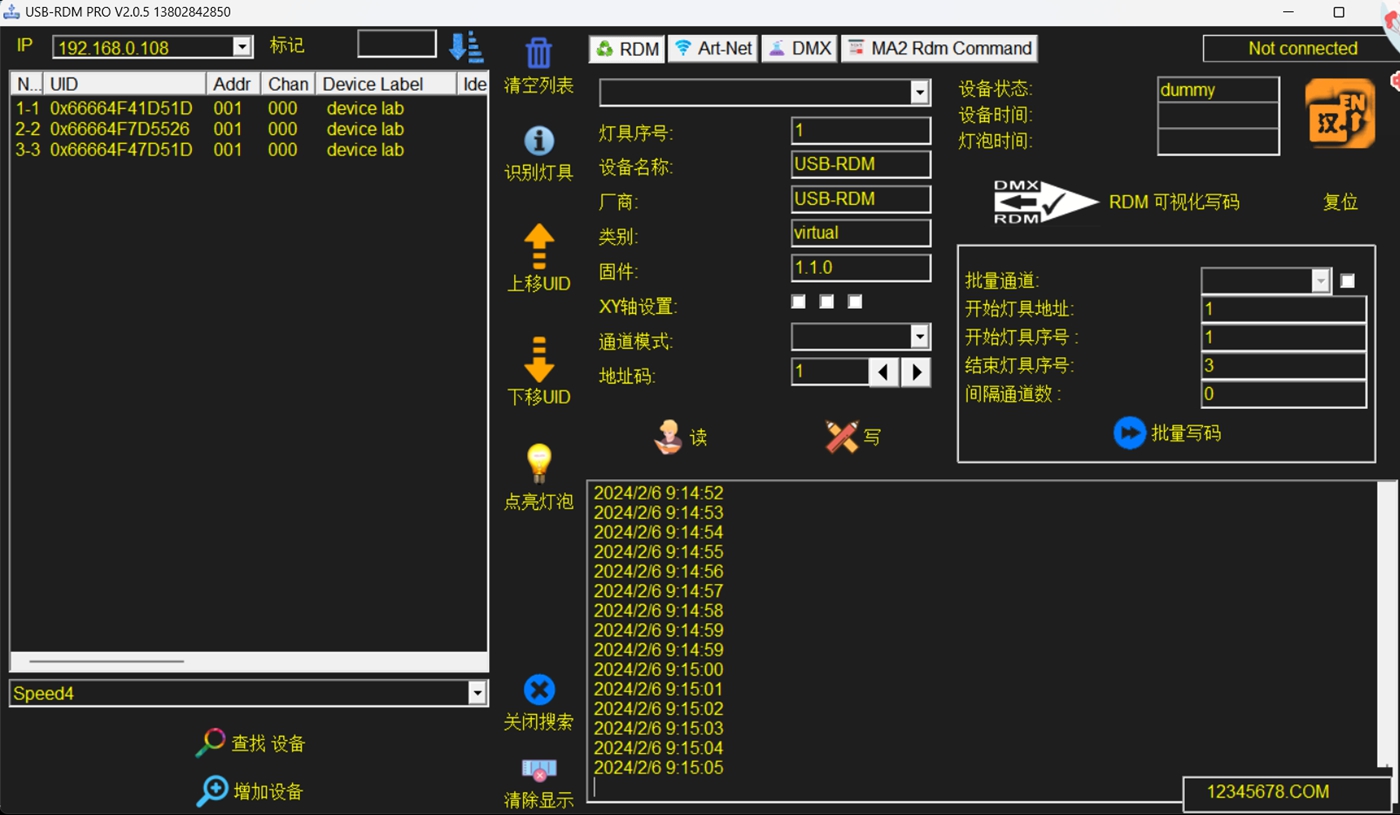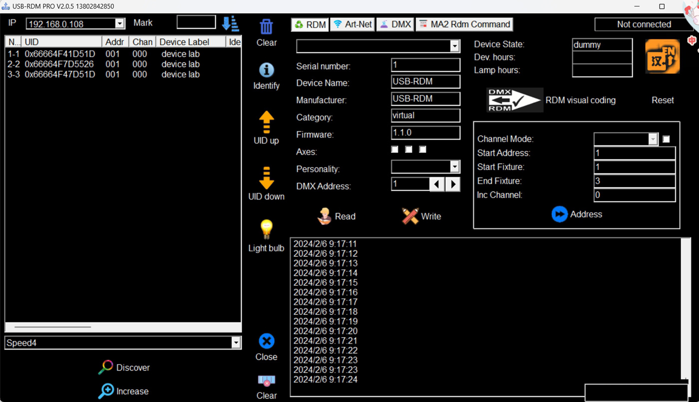 USB-RDM PRO comes with a running log area, which can perfectly record the RDM/DMX operation.