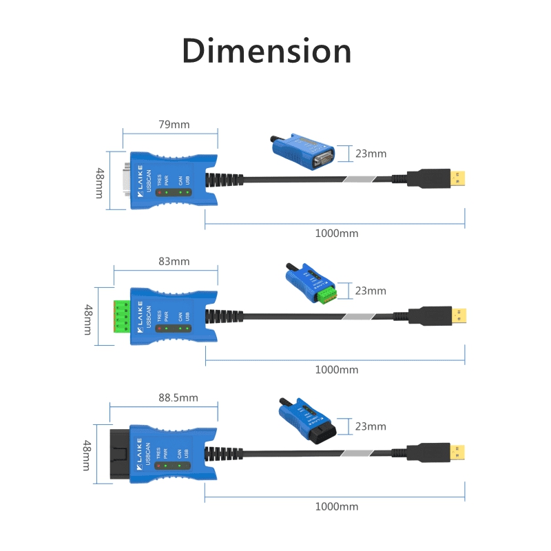 - Size: DB9: 79 x 48 x 23mm; Terminal: 83 x 48 x 23mm; OBDII: 89 x 48 x 23mm