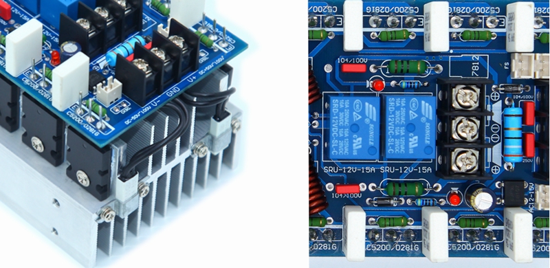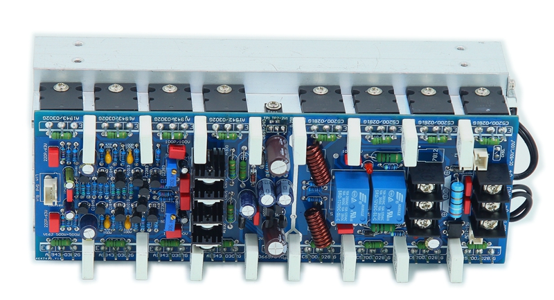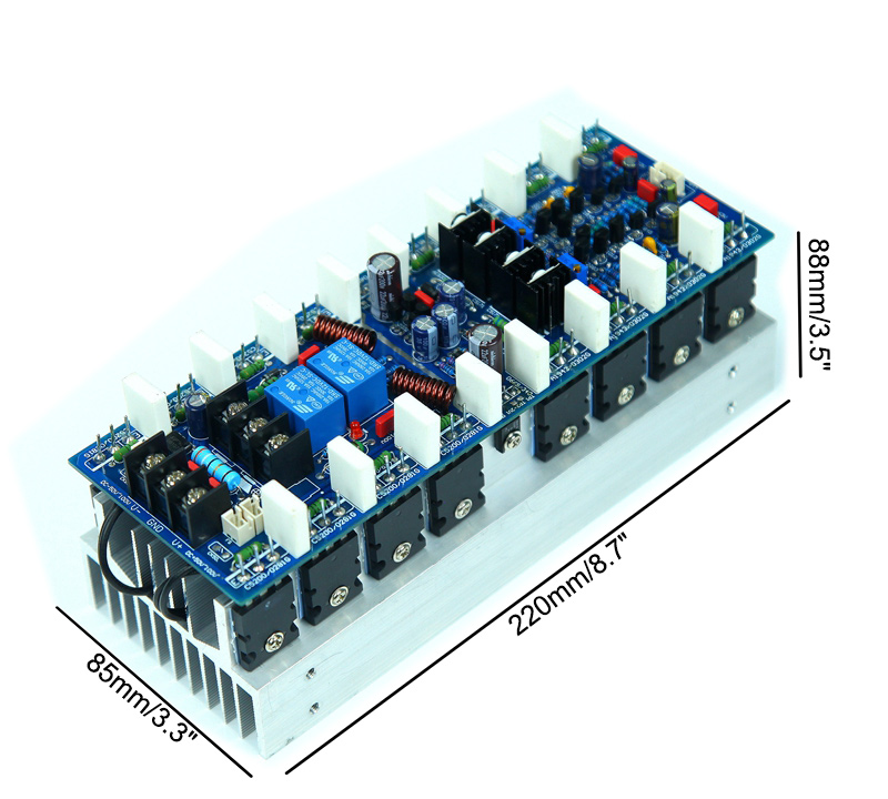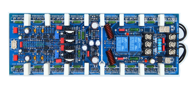 - Dual differential circuit is used for pre-amplification, and the timbre is clear and delicate. The push stage uses three stages to push. After the input differential amplification, push the medium power transistors, and then push TTC5200/TTA1943 as power output. The amplifier board is 2-channel. Each channel adopts 4 pairs of new imported transistors, TTC5200/TTA1943 in parallel for output. 2 channels with a total of 16 transistors in parallel for outputs. The design can improve the use effect, full of thrust.