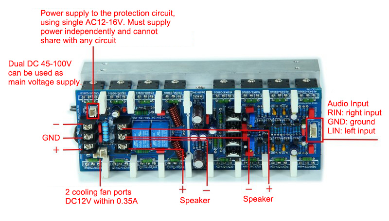 - Power supply voltage range: dual DC 55V-100V (The recommended working voltage is dual DC about 60V. It is recommended to use a transformer above 400W. Use dual AC 40-70V, add a rectifier filter plate and then use it. If you want to fully exert the energy of the amplifier board, you need to use a transformer above 1000W).