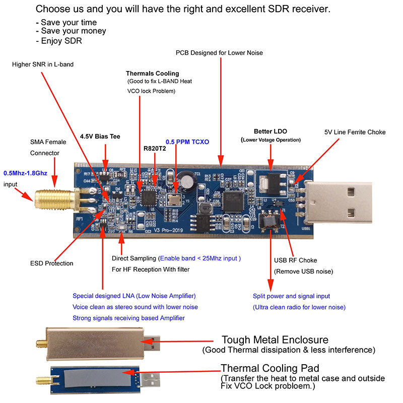 V3 Pro SDR Receiver SDR Radio Receiver with RTL2832U R820T2 for RTL-SDR 500Khz-2GHz UHF VHF HF AM FM
