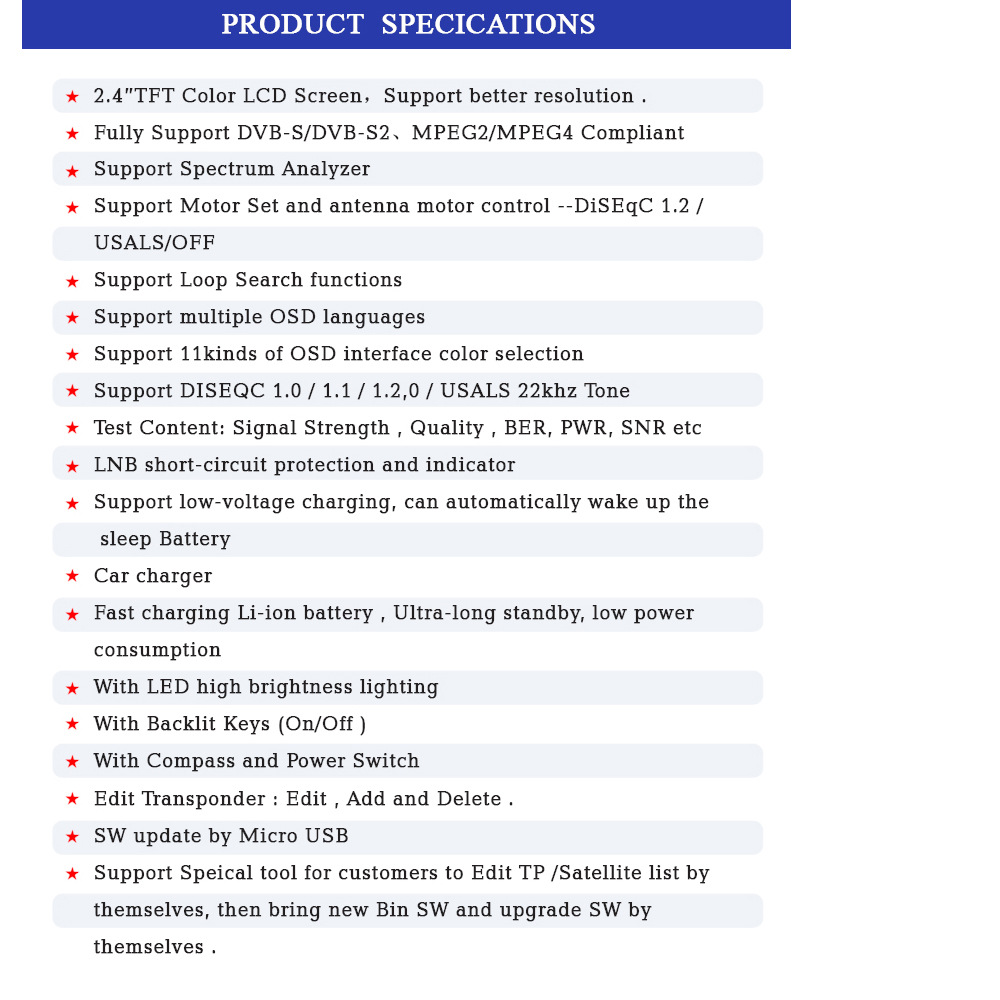 - Support Motor Set and antenna motor control –for DiSEqC 1.2 /USALS/OFF