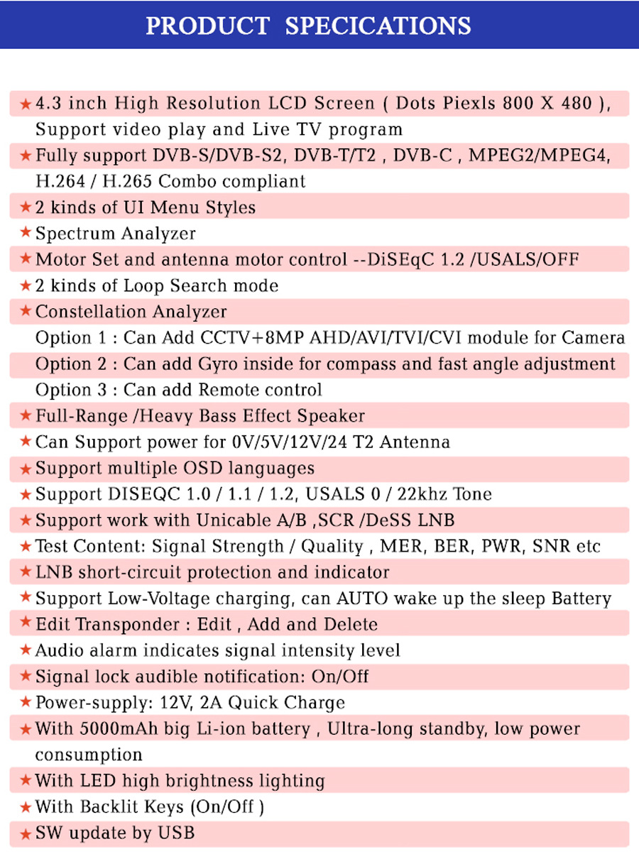 - Support DISEQC 1.0/ 1.1/ 1.2, USALS 0 / 22khz Tone