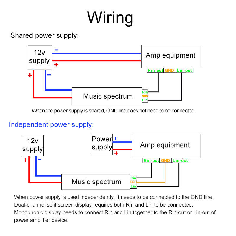A: Yes, there are two situations for this connection. The first is to use a power source that shares the same ground with an amplifier, such as the one on a car. At this time, connect any speaker wire to Lin or Rin, and GND does not need to be connected again. In the second, a separate power supply is used. At this time, the power supply is isolated from the power supply of speaker amplifier. Connect any wire of the speaker to the gnd of the amplifier to Lin and GND of this screen. If only one speaker is connected, two speaker wires can be directly connected to Lin and GND of the screen.