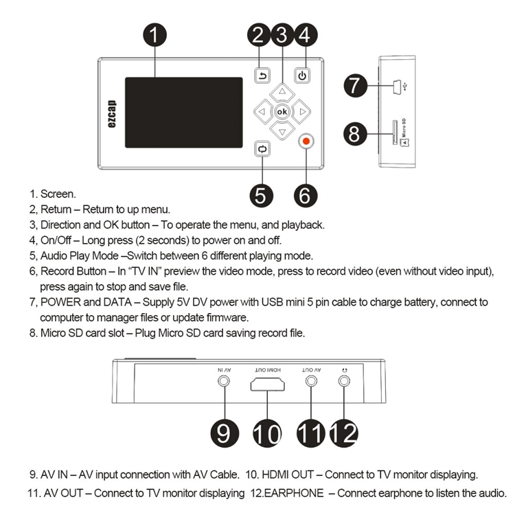 With this AV Recorder, you can convert your old video tapes or camcorder tapes to digital format with one click of button, record and digitalize video from VHS, VCR's, DVD Players, DVR's, Camcorders and Gaming Systems. No computer required, records video directly. Includes 8GB memory card inside, and supports extra Micro SD Card input. Ezcap271 also can convert old music to digital format, and playback video, music and pictures.