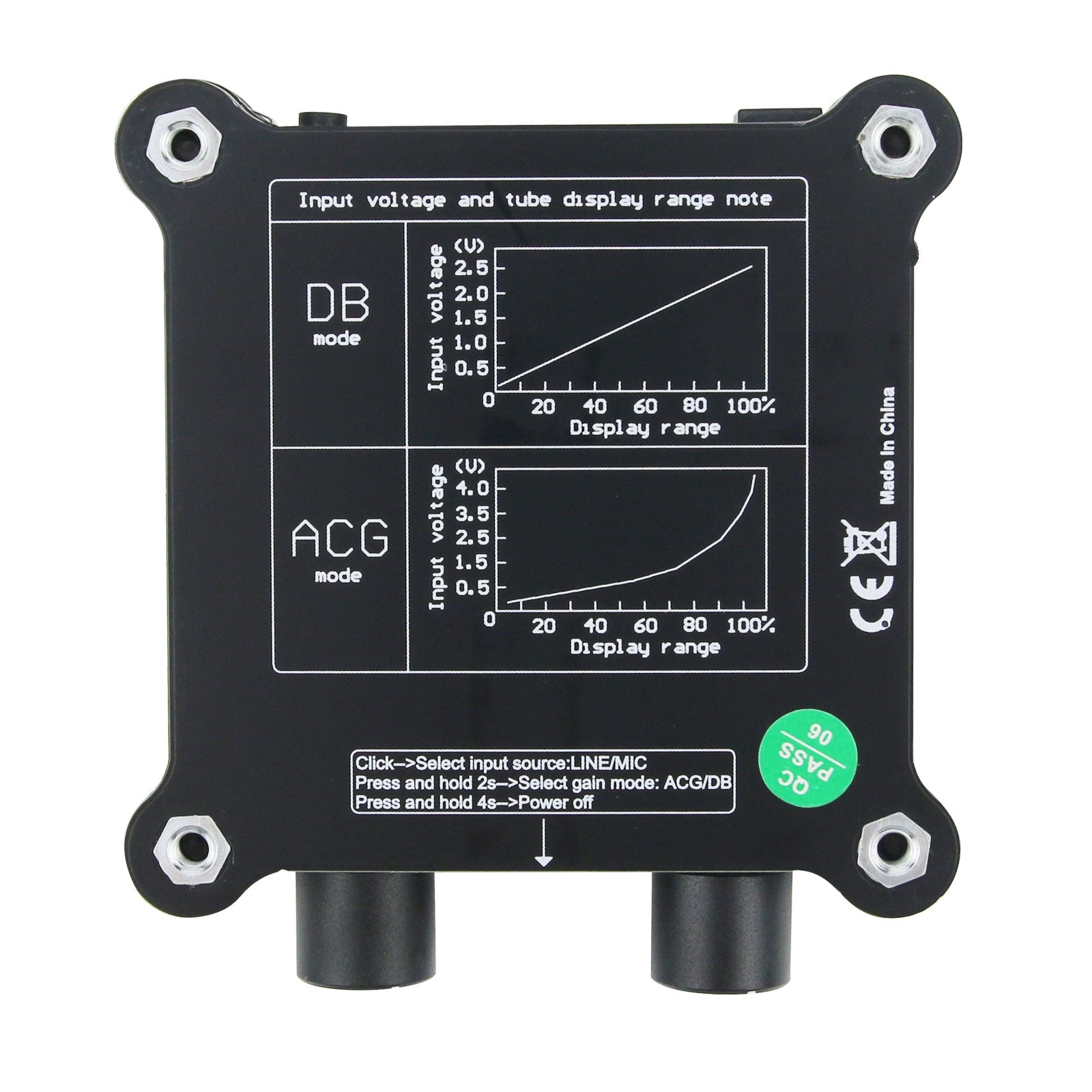 1.In ACG mode, the VU meter is driven by a dynamic square root audio compression algorithm, which means that the relationship between input volume and light beam swing is not proportional. It can be seen from the relationship diagram that when the input volume is small, the swing amplitude of the light beam is larger, and when the volume gradually increases, the swing amplitude of the light beam gradually becomes smaller. In this mode, users can use the VU meter in a larger audio input range without adjusting gain, and can obtain a good display effect at the same time. When the light beam jumps with music, even if volume input is too small, light beam will jump. Even if volume input is large, the maximum swing will not be reached. It is recommended to adjust GAIN to make the beam of light swing as close as possible to 70% (0dB), the effect is better. Driven by the algorithm of dynamic square root audio compression, it cannot truly display the true level of the current input volume, so it is not suitable for professional recording occasions. But this mode is suitable for people's regular hearing habits. Because human ear hears sound and the loudness of the sound has a ratio, not 1:1. For example, a 20W speaker and a 100W speaker have a power ratio of 5 times. If tubes are lit according to the actual length, there should be 5 times the display length change. But human ear does not sound like this, and only feels that the sound is only about 2 times different in loudness. That is to say, the sound of 100W seems to be only twice as loud as the 20W (about 40W, which is not the case). This is the actual difference, so in this case, if the light beam is lit up to about twice the length of the human vision It can match with hearing. Feeling more comfortable. But if it jumps according to the real value. The beam of light was lit up 5 times the length, which caused the sensory mismatch. Relatively less comfortable. (Only for most people, not all situations.)