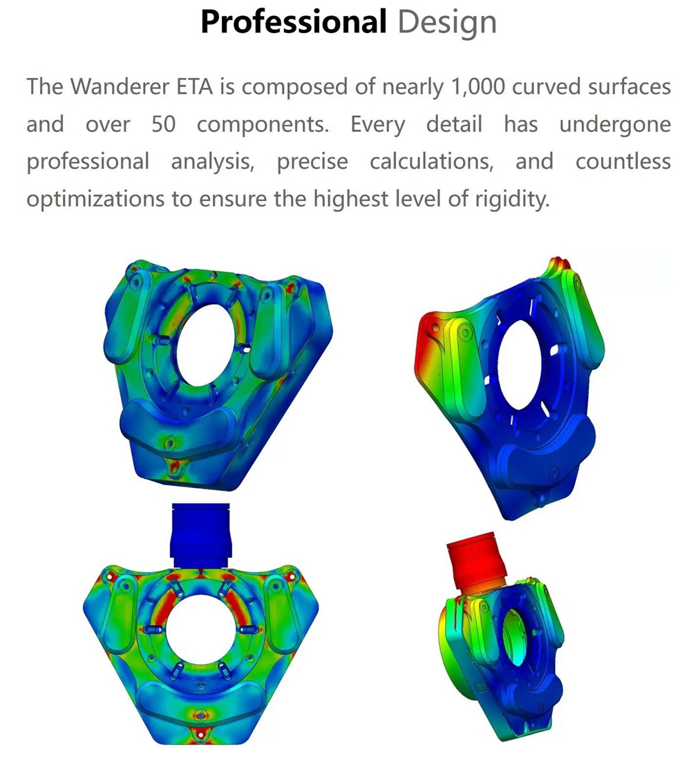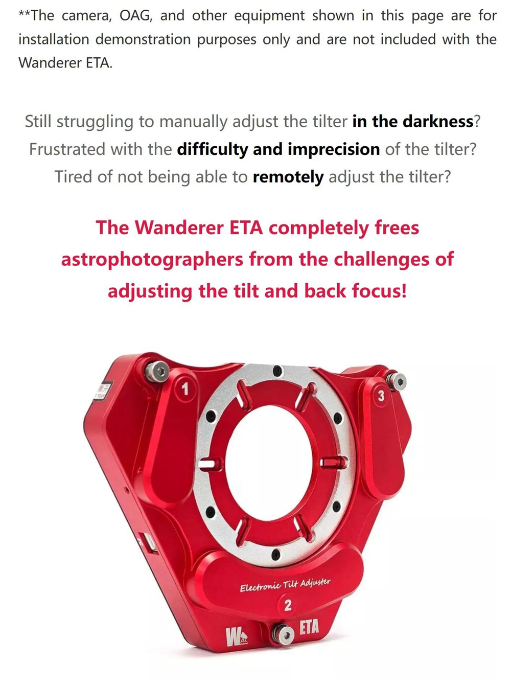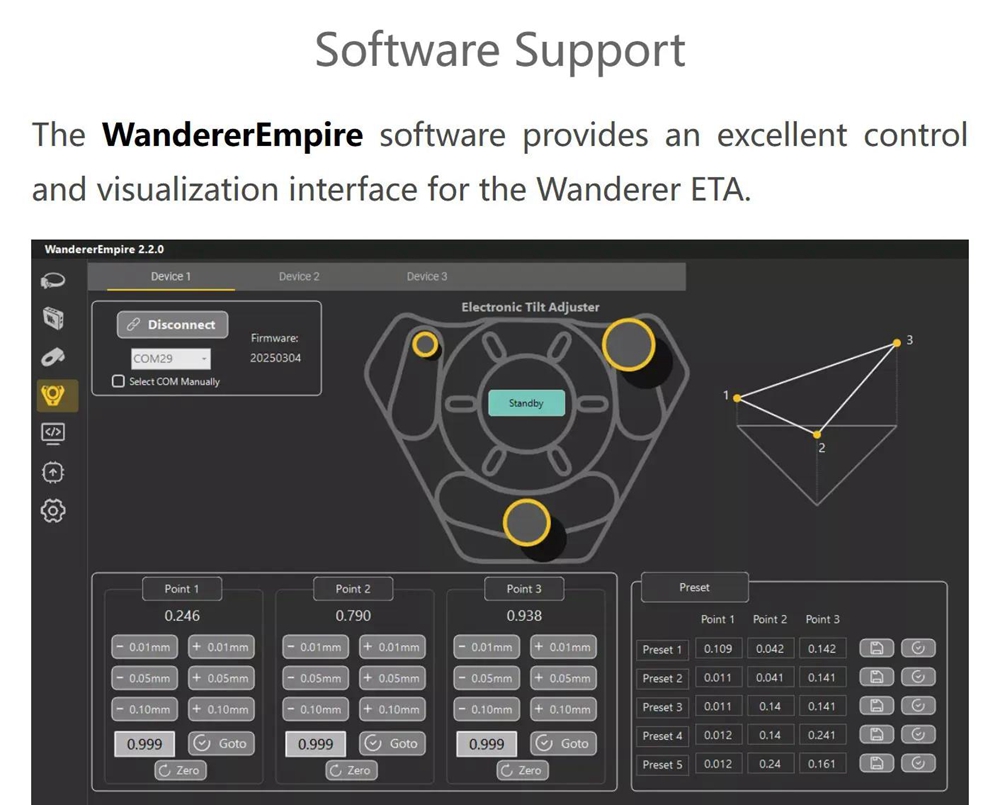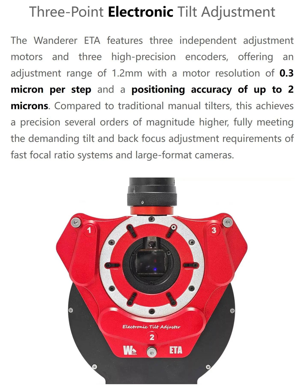 - The Wanderer ETA features three independent adjustment motors and three high-precision encoders, offering an adjustment range of 1.2mm with a motor resolution of 0.3 micron per step and a positioning accuracy of up to 2 microns. Compared to traditional manual tilters, this achieves a precision several orders of magnitude higher, fully meeting the demanding tilt and back focus adjustment requirements of fast focal ratio systems and large-format cameras.