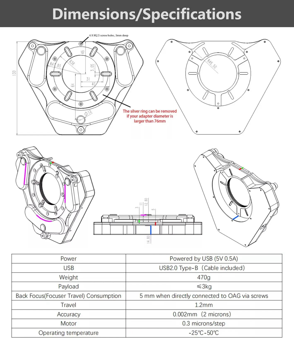 - The Wanderer ETA can also be connected to OAG/filter wheel/camera with M54 threads, you need to purchase our Camera Side M54 Female Adapter for Wanderer Electronic Tilt Adjuster M54 (WETA54-M54F.Sold separately)