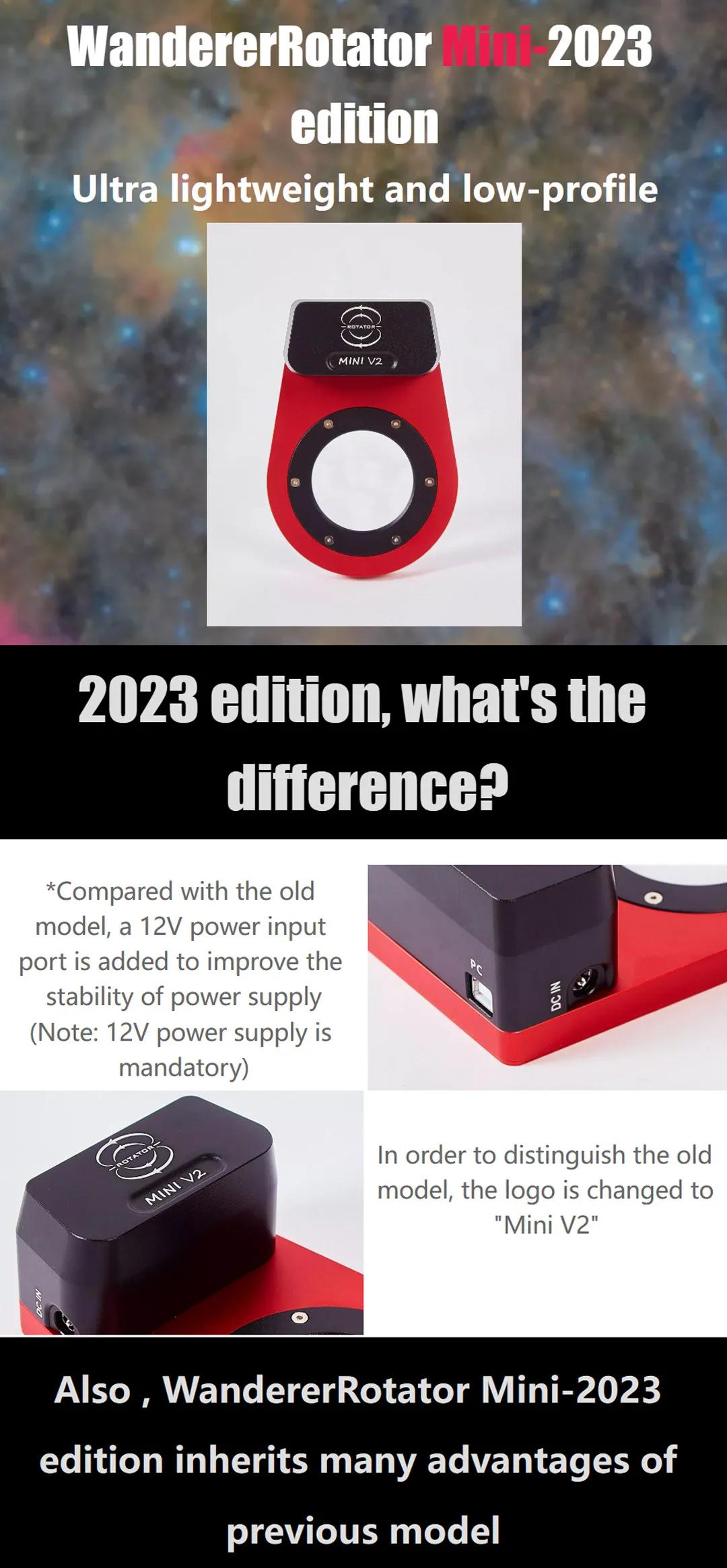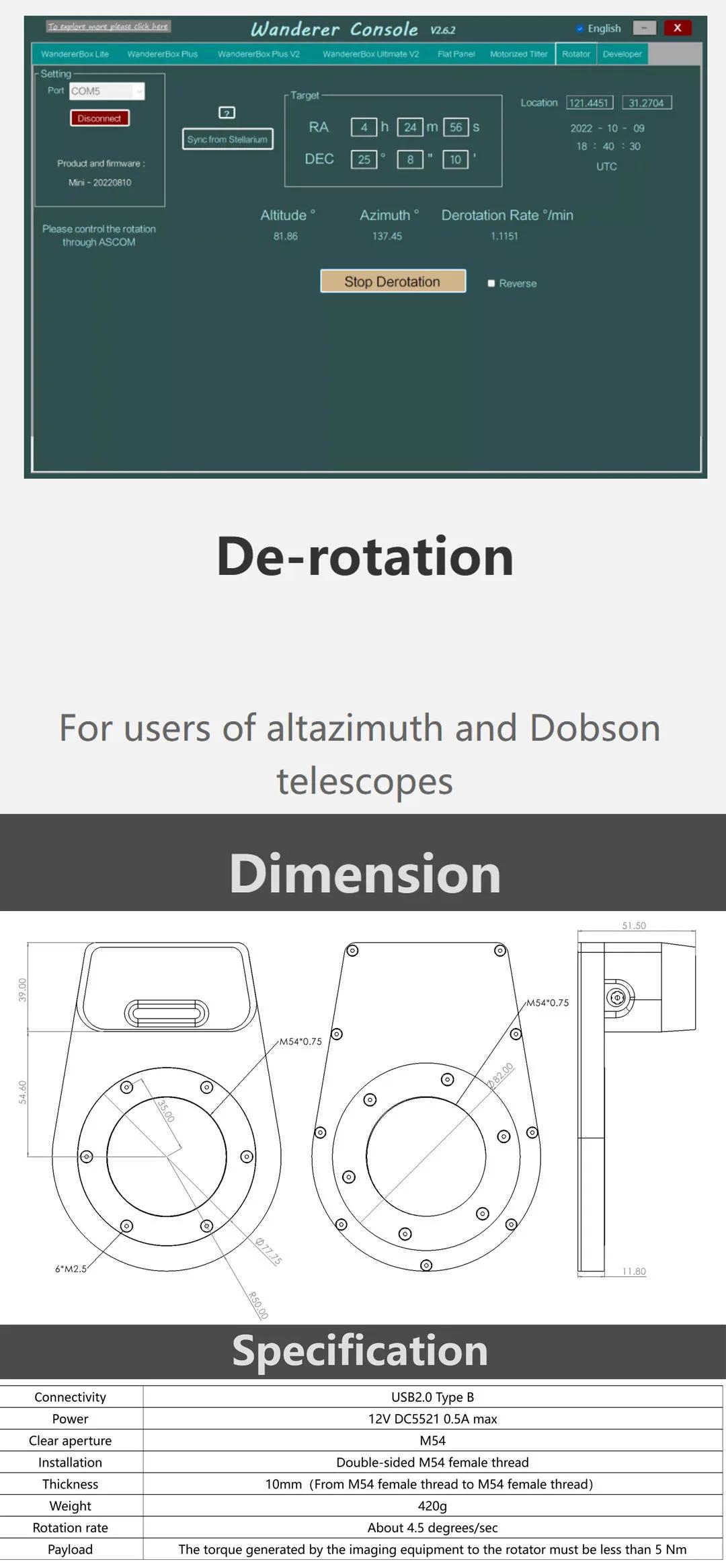 WandererRotator Mini V2 M54 Electric Camera Rotator Long-profile and Ultra-lightweight Rotator for Telescope Angle Adjustment