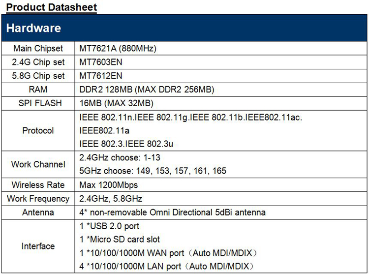 Used new MT7621 wireless solution, WG208 performs better with more functions. Stable wireless performance and its maximum transmission rate could be 1200Mbps, 2.4G 300Mbps, 5G will be 867Mbps. It is designed with 1* USB2.0 interface, 1*TF Micro slot.