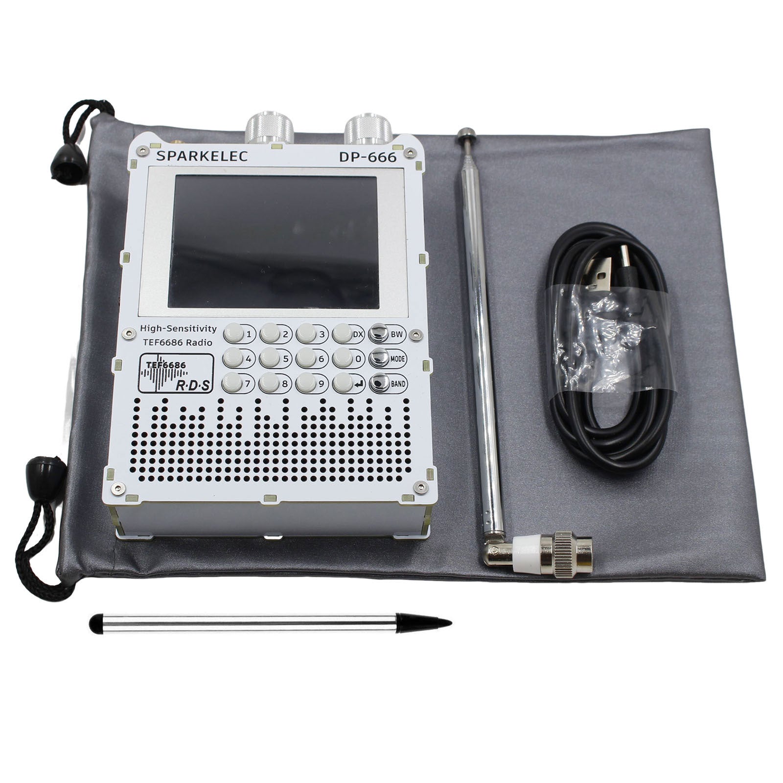 - DP-666 is a high-sensitivity radio based on NXP's high-performance automotive-grade TEF6686 chip, which has excellent selectivity and ultra-high sensitivity. This automotive DSP tuner has a wide range of functions and advanced algorithms (CEQ, EMS, iMS and PACS, noise canceller...), SDR(software-defined radio) signal processing, especially for improvement of multipath, adjacent frequency interference, weak signals There are significant advantages in processing and noise cancellation. DP-666 is a radio built on PE5PVB's open source project TEF6686_ESP32. In addition to listening to radio stations, the project also supports a wealth of advanced features, such as: almost all RDS (Radio Data System) data display, automatic/manual station scanning, squelch function, battery voltage display, changeable themes, multilingual, station presets, and more. We redesigned the circuit board with reference to the mature TEF6686 front-end receiving circuit, and equipped the DP-666 with a 2.8-inch LCD color screen with resistive touch based on the open source project. While ensuring the portability of the machine, it can display rich RDS information (RDS information requires local radio support); a numeric keypad is added to facilitate users to quickly input frequencies; and a large-capacity 5000mAH battery supports longer standby time. In short, I hope you will be satisfied with this portable high-sensitivity travel radio! As the firmware is still under development and new features will be introduced, this manual is bound to have omissions and errors. Please understand.