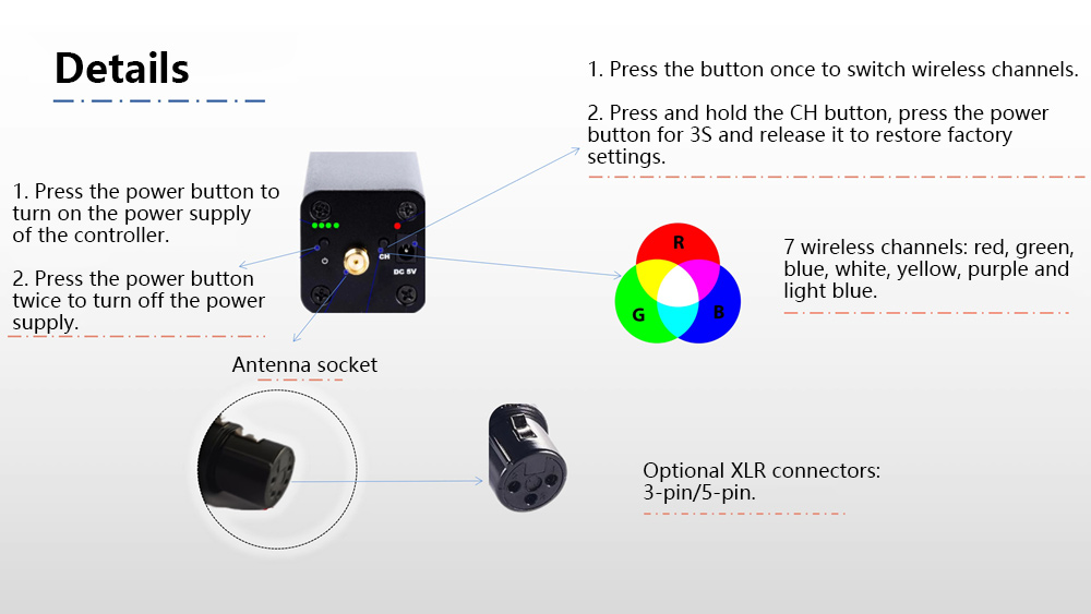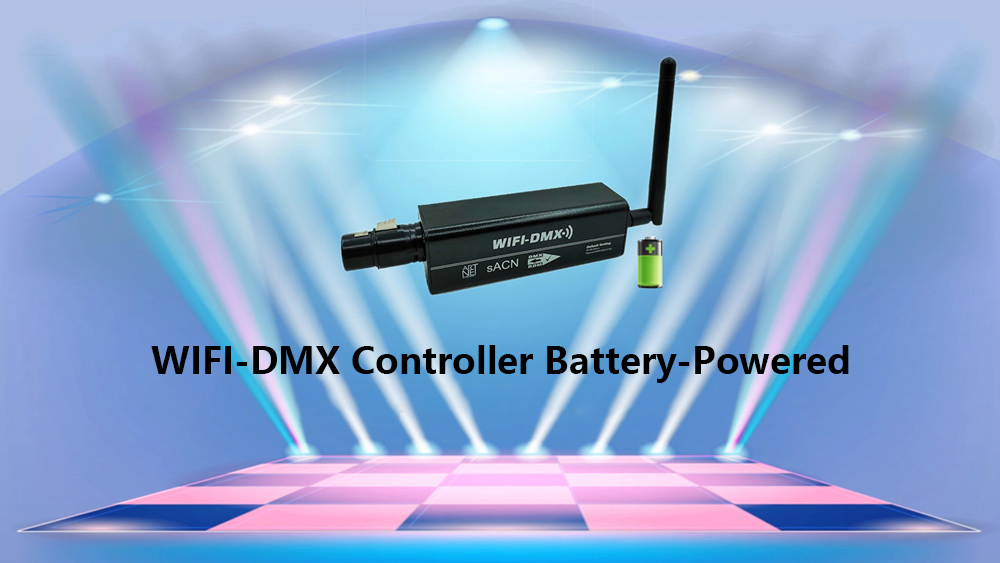 It is designed with buttons and indicator lights. Multiple controllers can be used at the same time in the same venue. WIFI-DMX supports master-slave mode and can be used with a control console or a WIFI-DMX signal amplifier. It can realize lighting control via a mobile phone at a distance of 200m/656.2ft, and can be used with a control console to control lighting. Furthermore, it has a battery life of up to 16 hours.