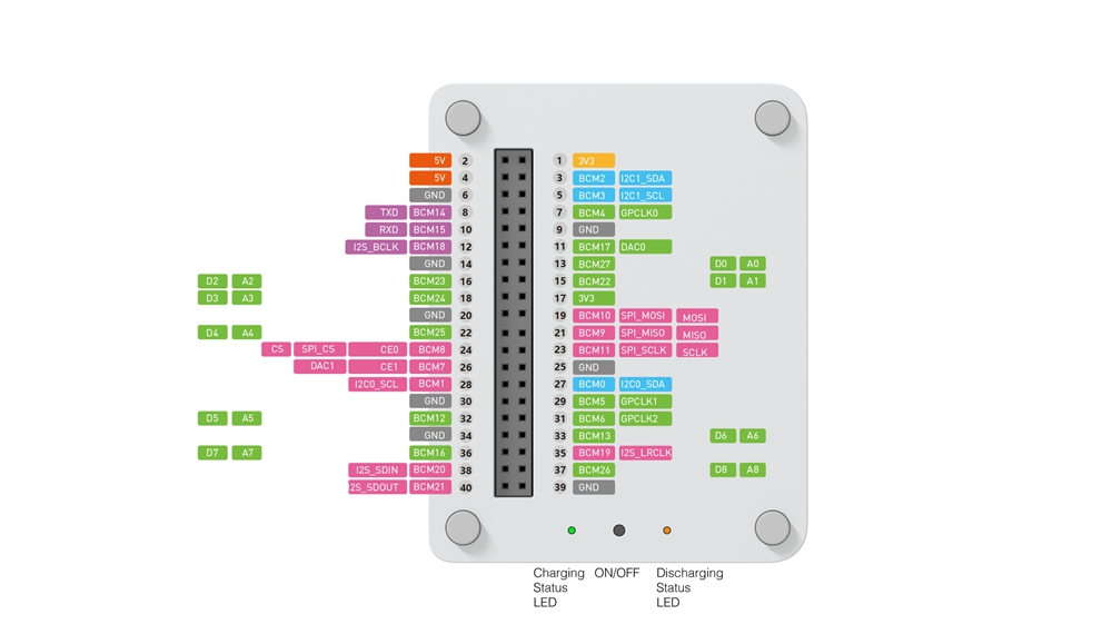 - Battery board mode: Green LED means that its circuit board is charging; Red LED means that OTG (battery discharge) is enabled; Yellow LED means that its male interface outputs/inputs 5V