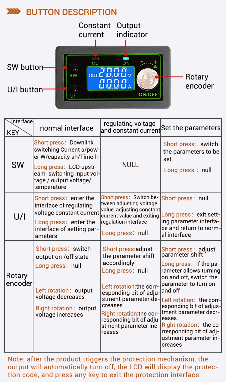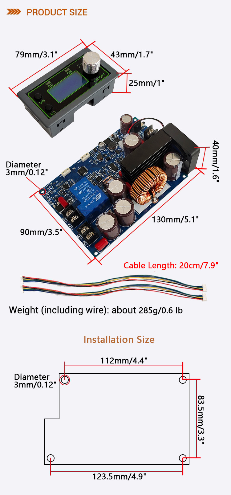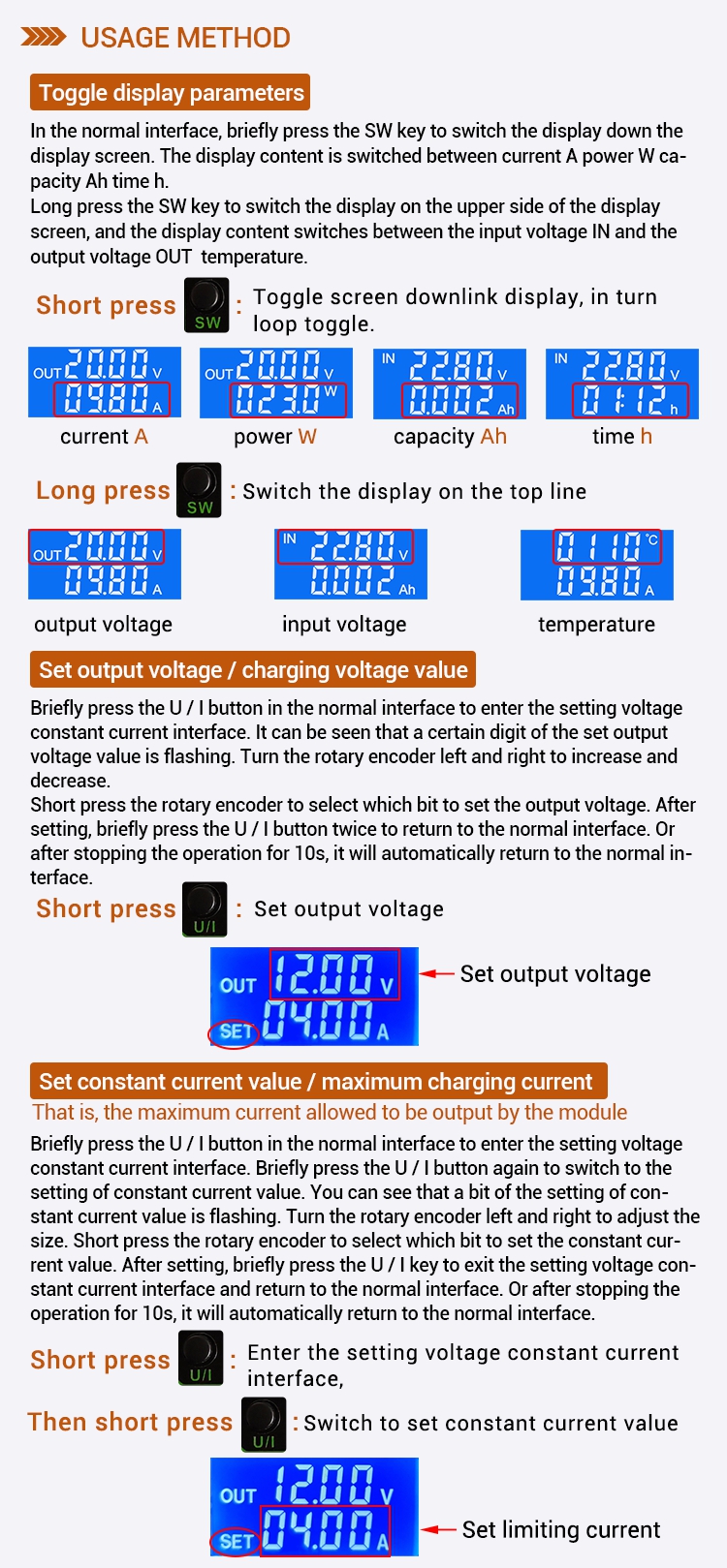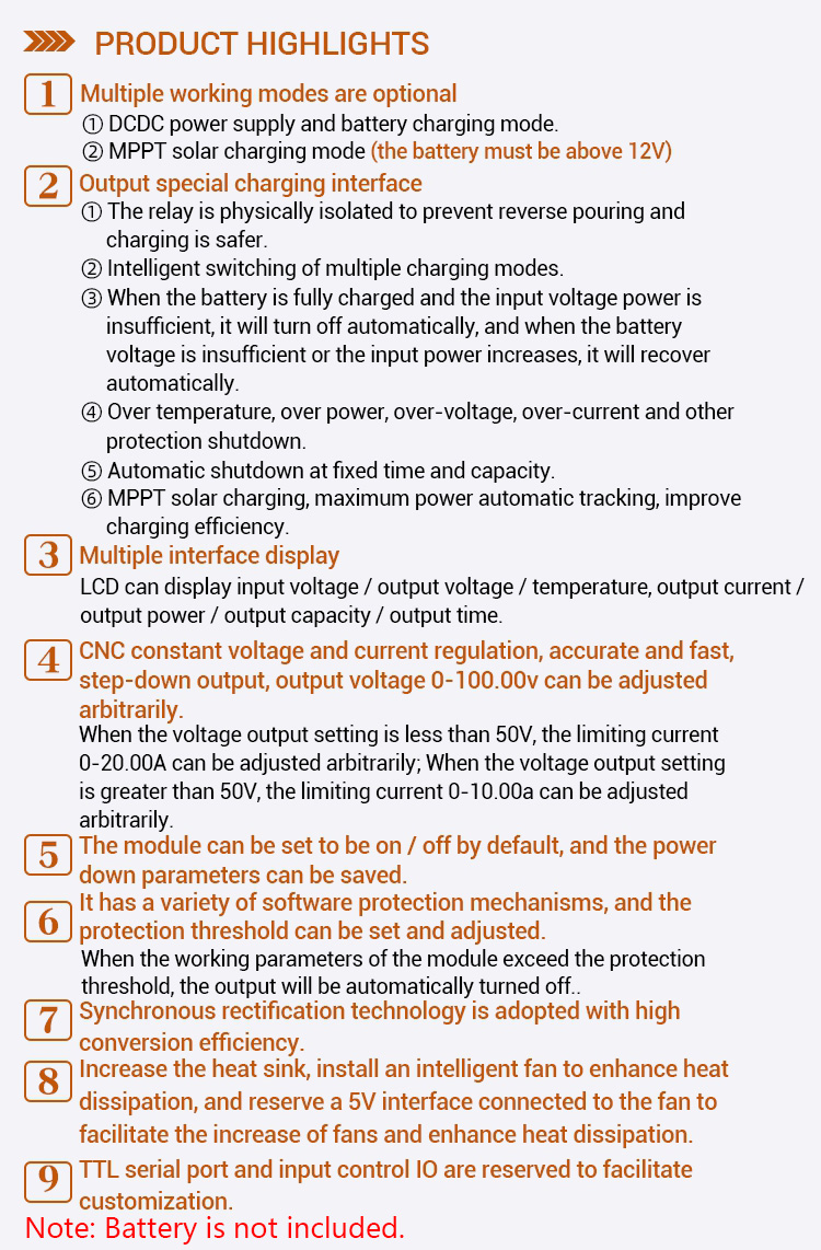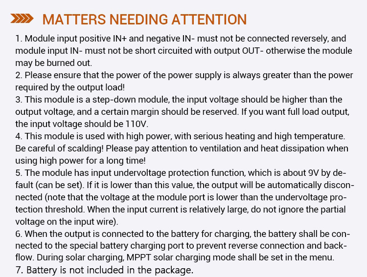 - This product is a step-down module and cannot be boosted. The input voltage is 110V maximum, and the output voltage can be adjusted from 0 to 100V. If the output is 12V, the input voltage must be at least 14V. The input voltage should not exceed 110V, DC power must be used instead of AC power.