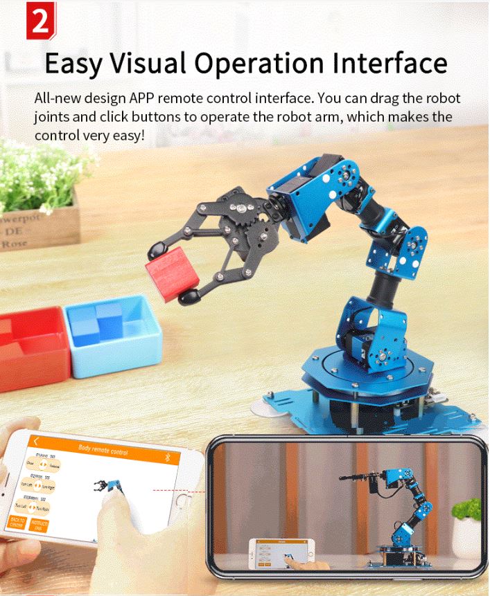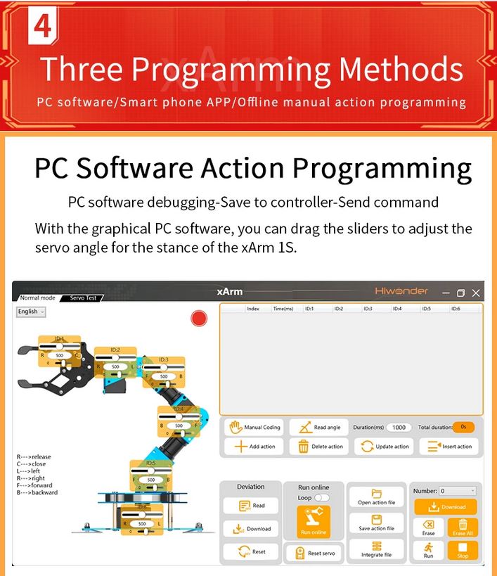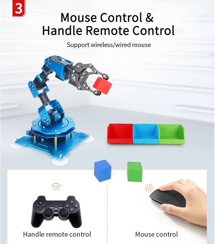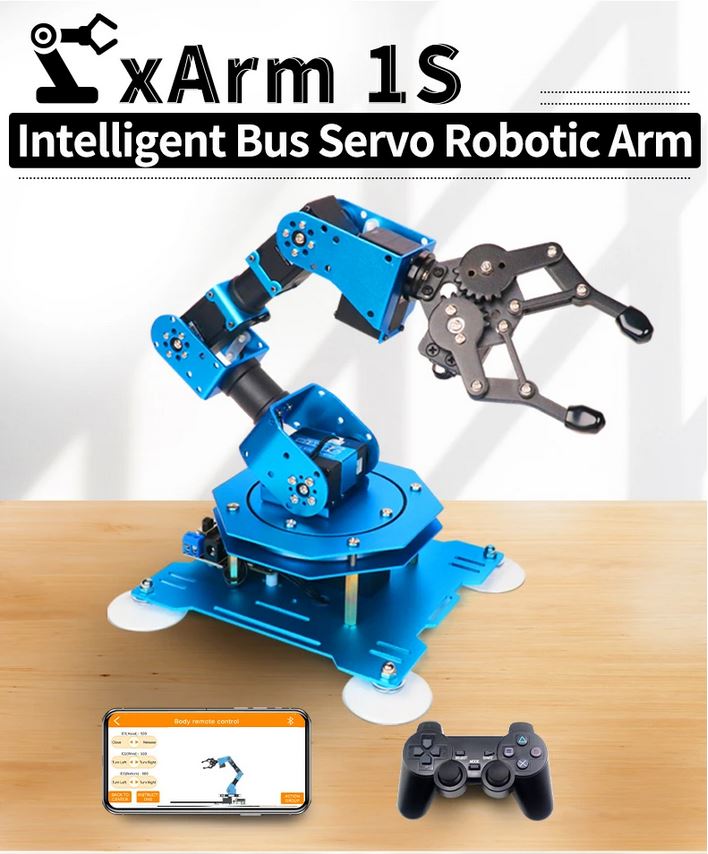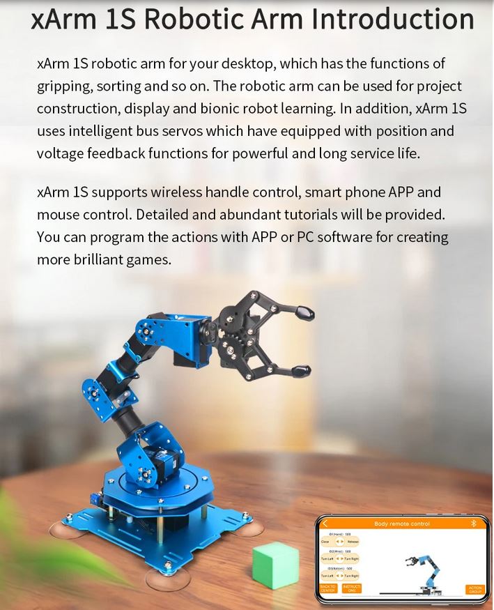 - xArm 1S supports wireless handle control, smart phone APP and mouse control.