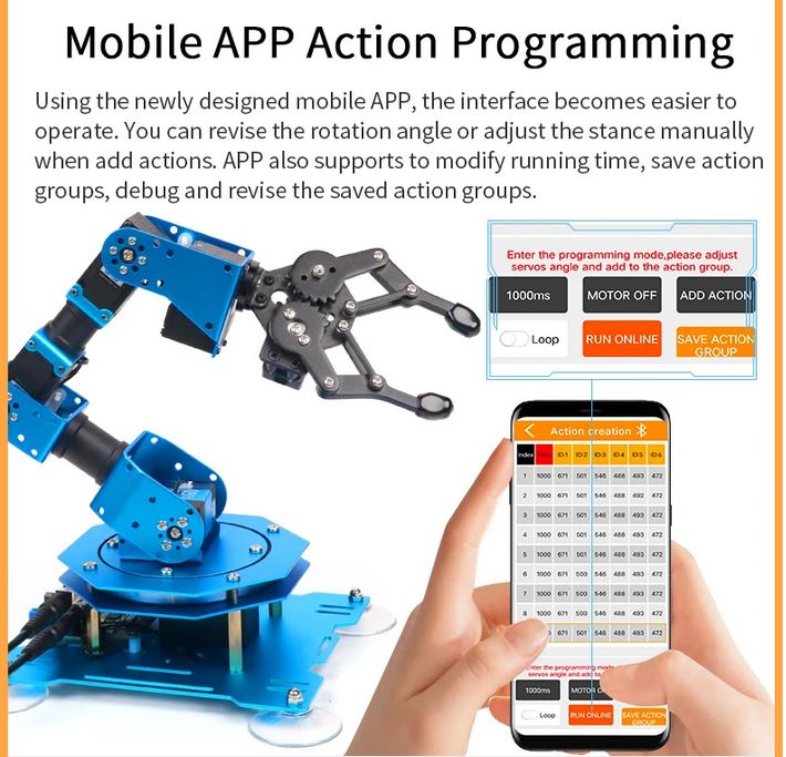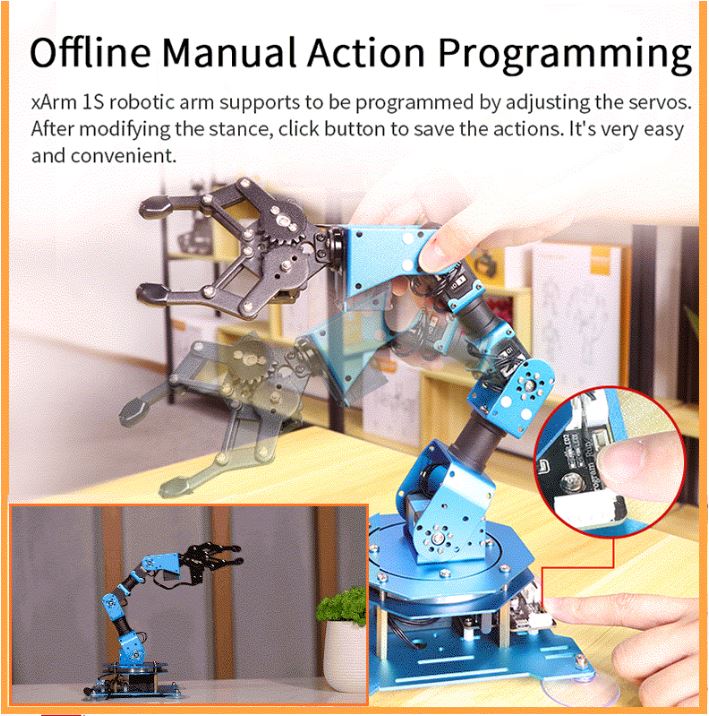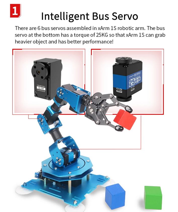 xArm 1S is the upgraded version for Hiwonder robotic arm, which contains six serial bus servos. The servo at the base is upgraded to 25kg torque. The unassembled and assembled versions can meet your different requirements. If you are looking for a robotic arm for basic programming learning, we are really happy recommend this useful xArm 1S!