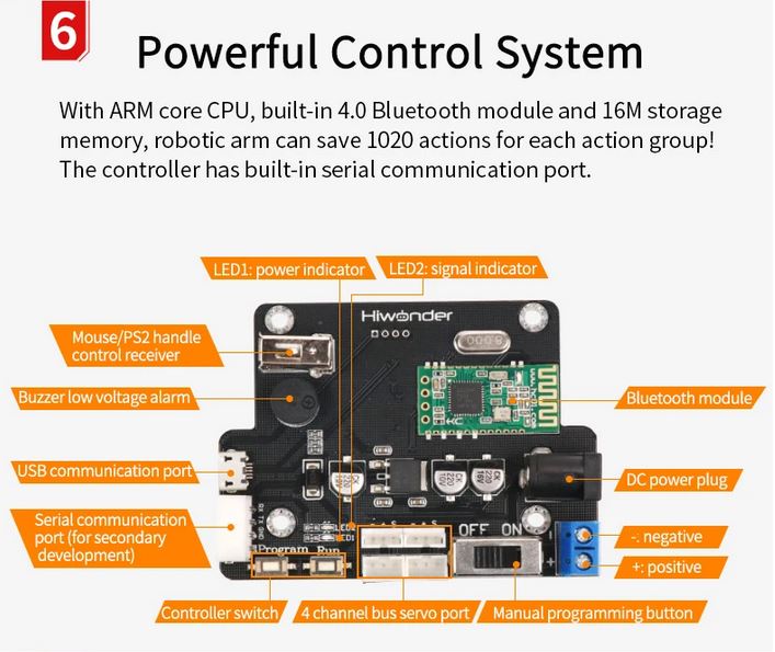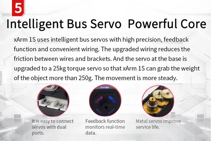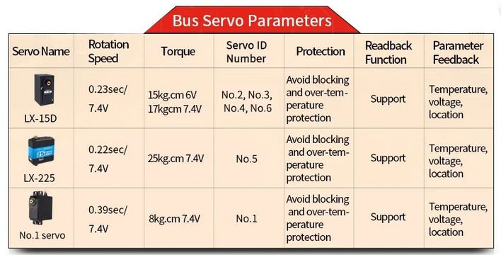 - Intelligent bus servos with position feedback, voltage feedback functions for powerful and long service life.