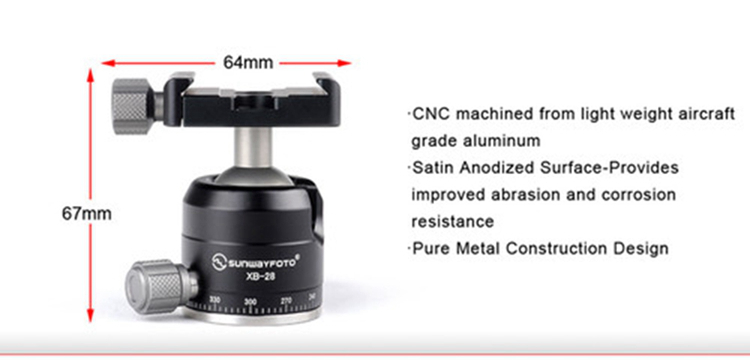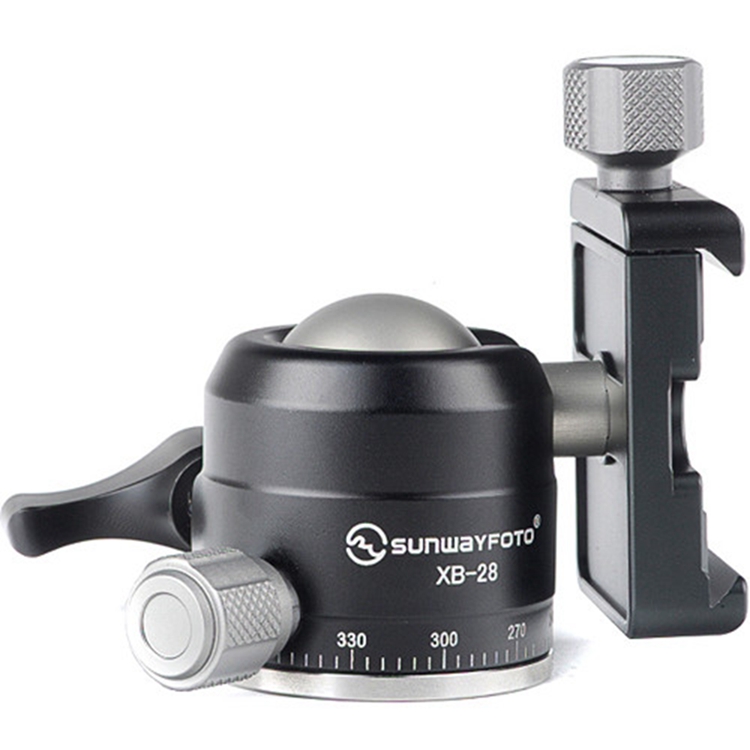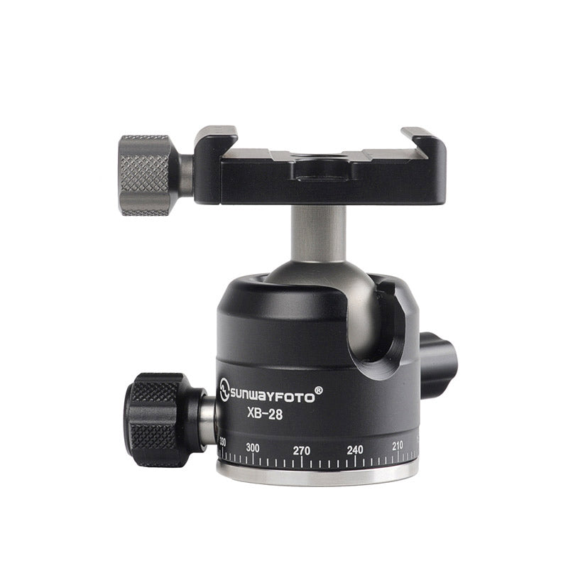 XB-28 Low-Profile Ball Head is suitable for Arca-type, and it has a load capacity of 9.9 lb, which is suitable for point-and-shoot and mirror-less cameras. Also, the ball head is ideal to use together with tabletop and small tripods because of its compact 2.6" in height and minimal weight of 0.4 lb. Furthermore, the main locking knob is located off to the side of the ball head instead of on the bottom, which lowers the center of gravity on the head. Also, the main knob has a ratchet feature that pulls out and repositions to gain better leverage for locking and unlocking the knob. Additionally, the head rotates a full 360° by unlocking the independent pan lock, and the CNC-machined aluminum has been anodized with a durable satin finish.