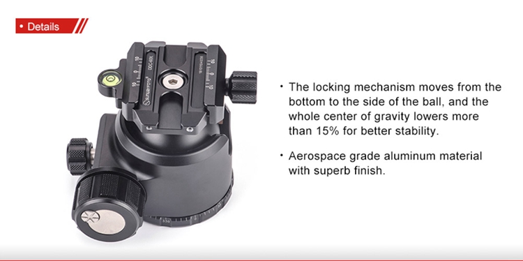 Low center of gravity, high locking strength ball head. Durable Type-III hard-anodized finish ensures its resistant to corrosion and abrasion.