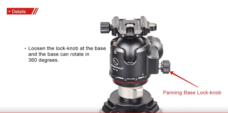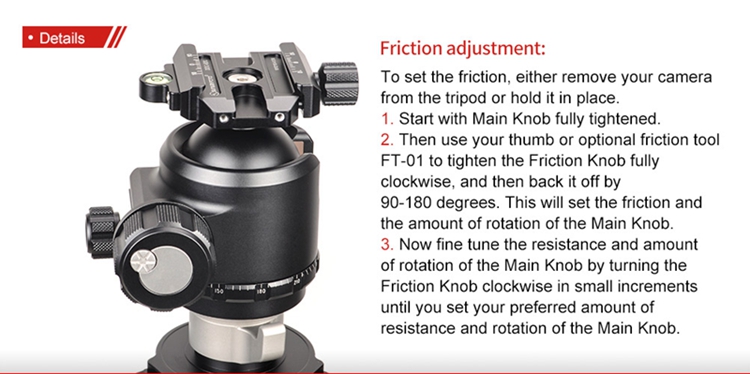 When there is camera loaded on the ball head, and the main knob is loosened up, DO NOT loosen the friction knob at the same time, otherwise the ball head will drop all of a sudden and may cause damage to the camera.