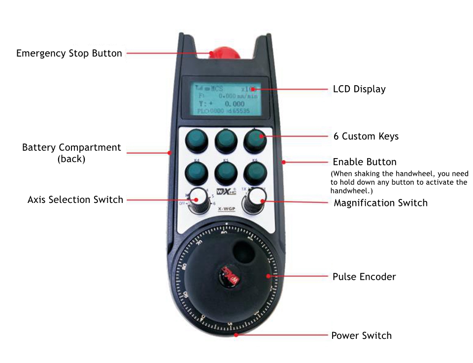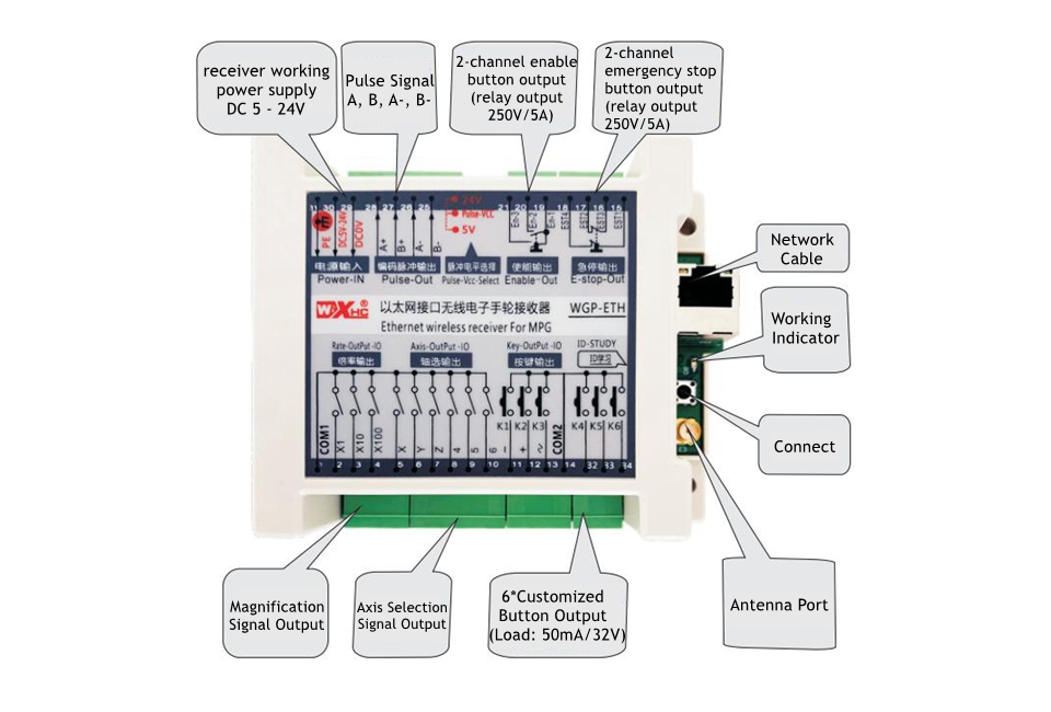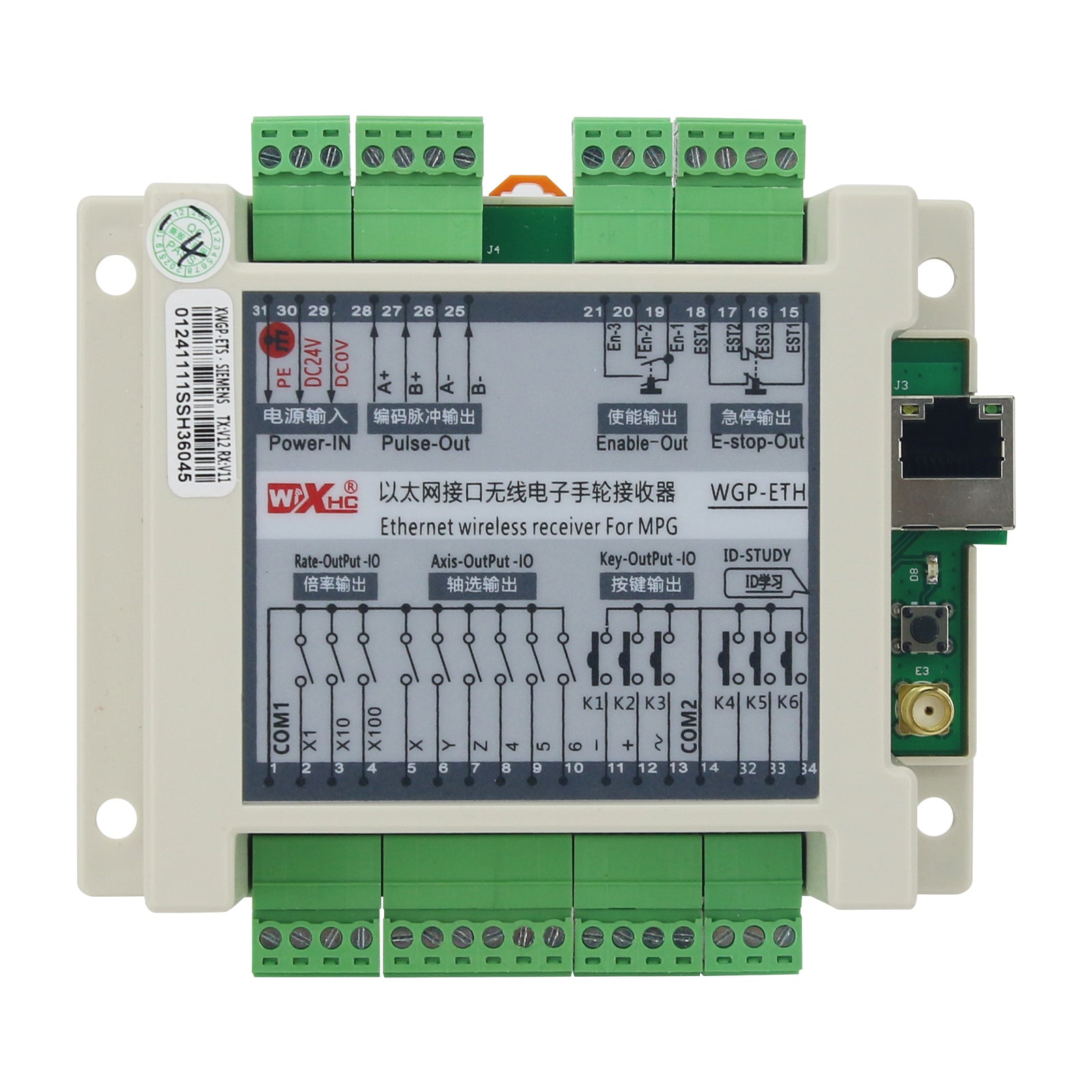 - This product is a manual pulse generator used in conjunction with CNC machine tools, and has been widely used in fields such as CNC machine tools, CNC lathes, machining centers, CNC engraving and milling machines. This product adopts wireless transmission technology, eliminating the traditional spring wire connection, reducing equipment failures caused by cables, eliminating cable dragging, oil sticking and other pollution, and making operation more convenient. This product set includes a receiver and wireless electronic handwheel. The receiver is connected to the CNC equipment through a network cable, and the electronic handwheel (hand pulse generator) communicates with the receiver through wireless transmission technology. The operator holds a handwheel and can move freely without being bound by the spring wire connection. For large-scale applications such as gantry milling, CNC lathes, walking machine tools, and cutting, it brings great convenience and improves work efficiency.