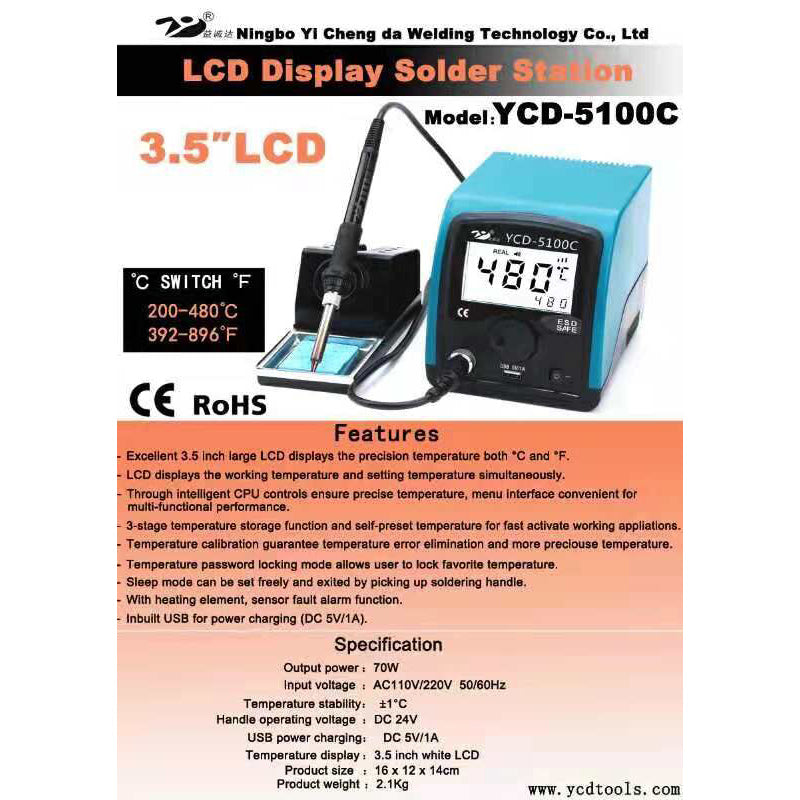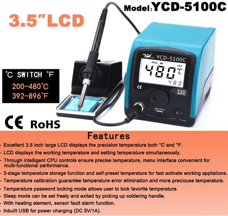 YCD-5100C Lead Free Soldering Station 3.5" LCD Display Switchable 200-480℃ & 392-896℉