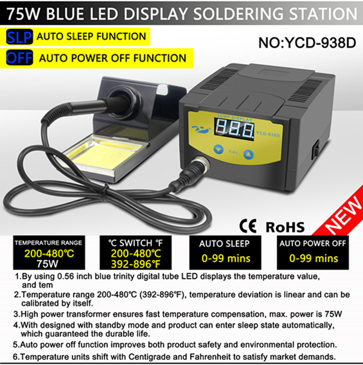 YCD-938D 75W Digital Lead Free Soldering Station Timing Auto Power OFF Auto Sleep 0.56" Display