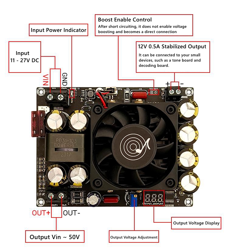 - Power supply voltage: 11 - 27VDC, output voltage above 27V will be unstable