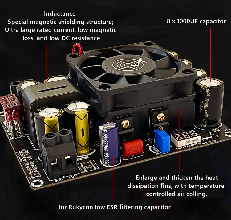 - Temperature controlled fan rotation condition: it will automatically run a 2-second self check when first powered on, and then stop. During operation, if the board temperature reaches 36 degrees centigrade or above, the fan will rotate, otherwise the fan will stop.