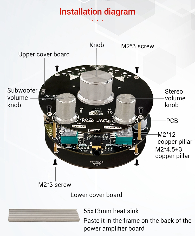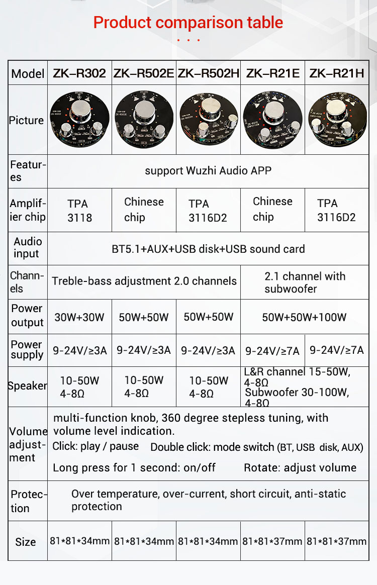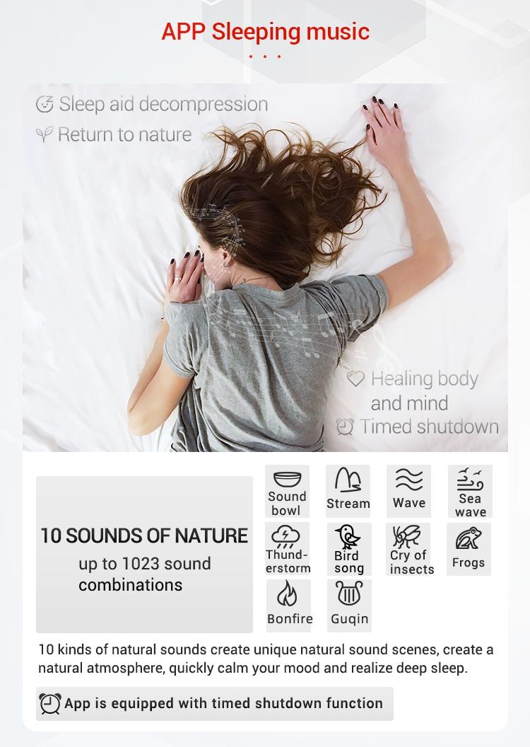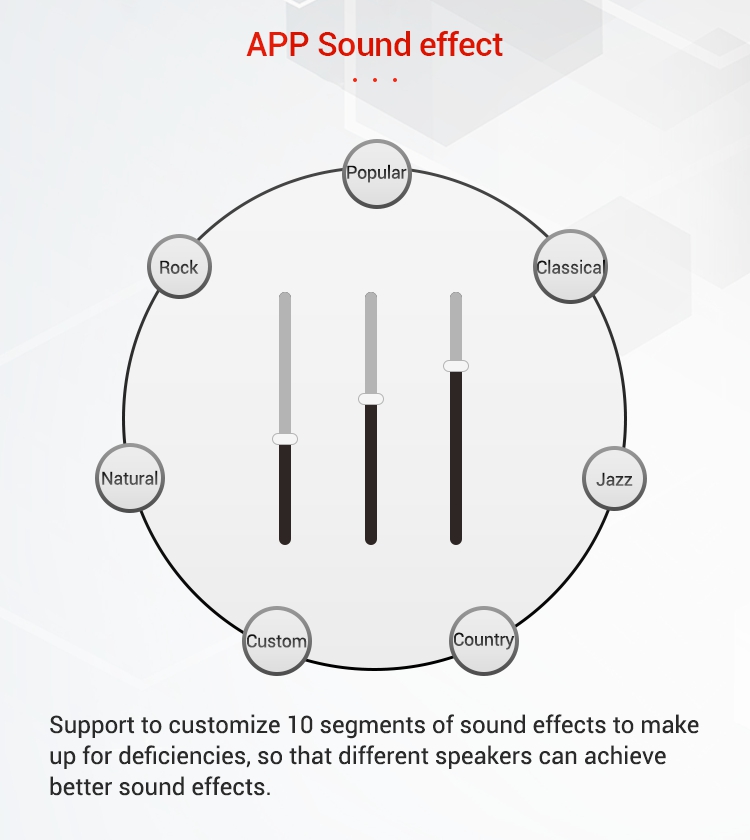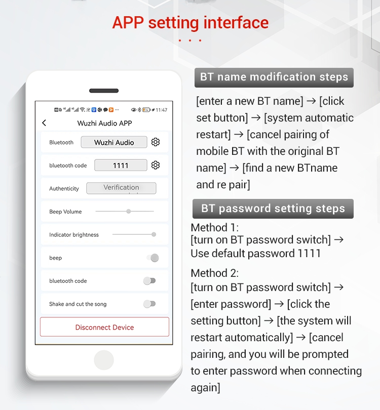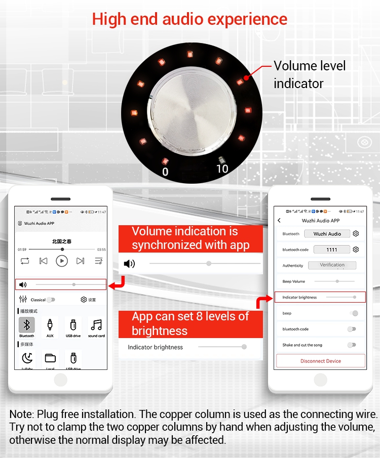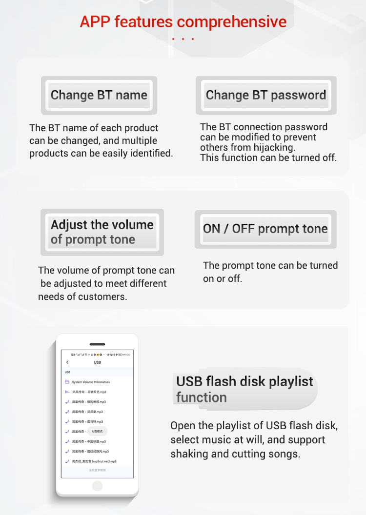 - Features: Support Wuzhi Audio APP. Modify bluetooth name, password setting, volume adjustment of prompt sound, power on/off prompt sound, sleep aid, sound effect selection + custom sound effect, U disk playlist, volume indicator brightness adjustment