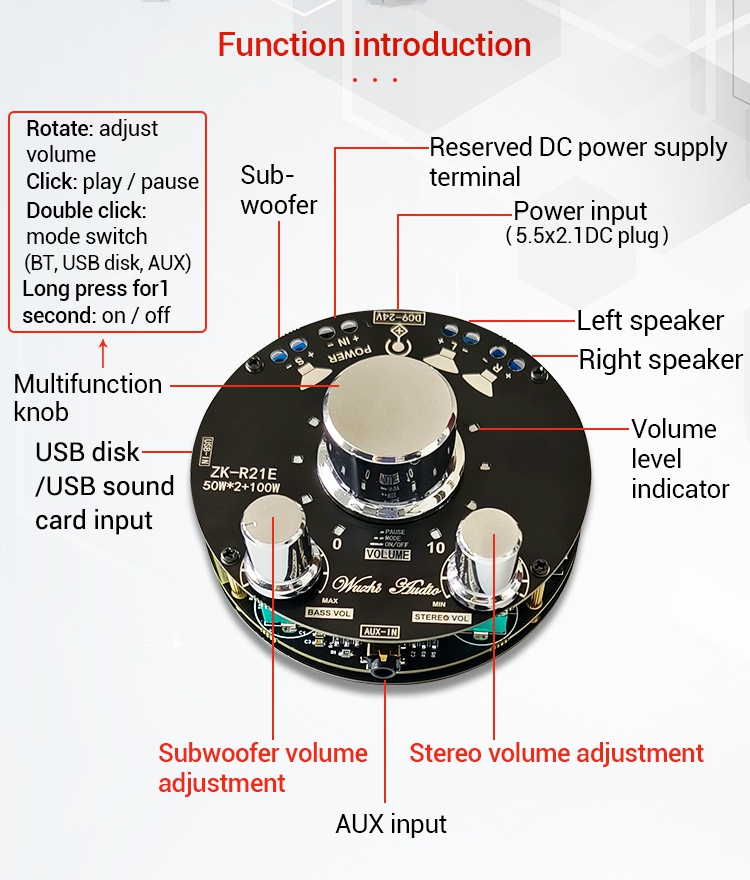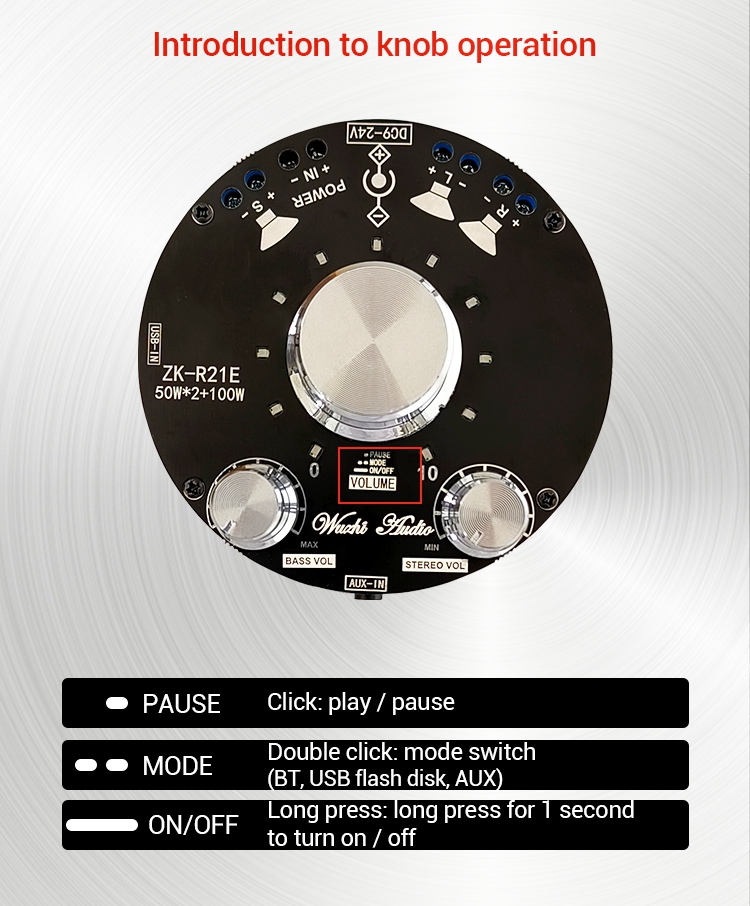 - Volume adjustment: multi-function knob, 360-degree stepless tuning, with volume level indication. Click the knob: play/pause. Double-click the knob: mode switch (Bluetooth/U disk/AUX). Press and hold the knob for 1 second: power on/off. Rotate the knob: adjust the volume