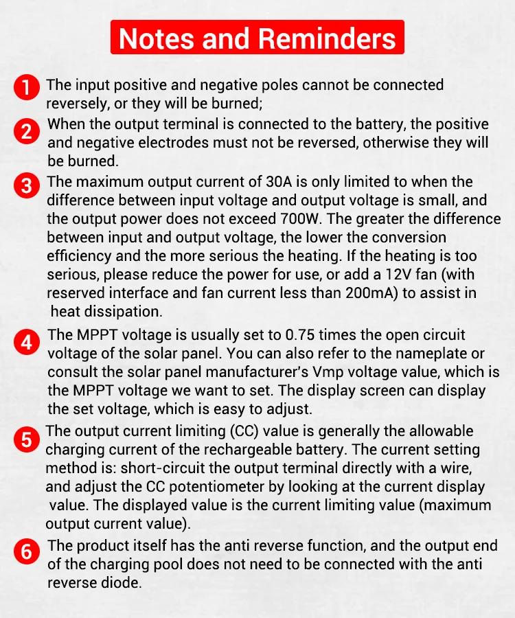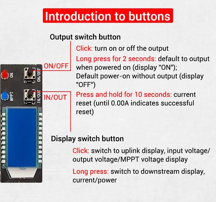 - Adjustment knob: MPPT voltage adjustment, output voltage adjustment, output curren limit adjustment
