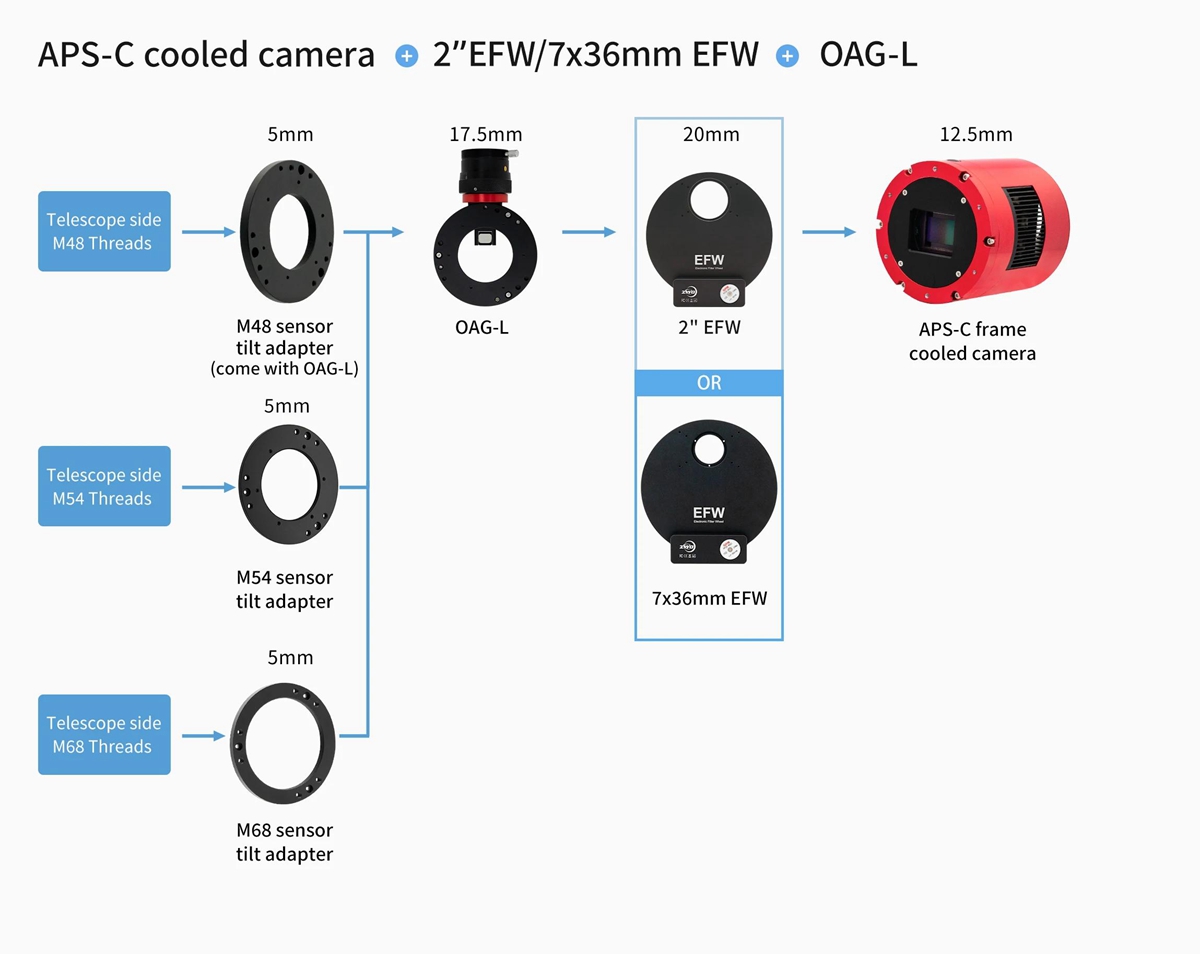 - If the thread of your telescope side is M48, then you don’t need to remove the M48 sensor tilt plate coming with OAG-L. On the contrary, you need to remove it and use some other sensor tilt plate at the corresponding thread of your telescope.