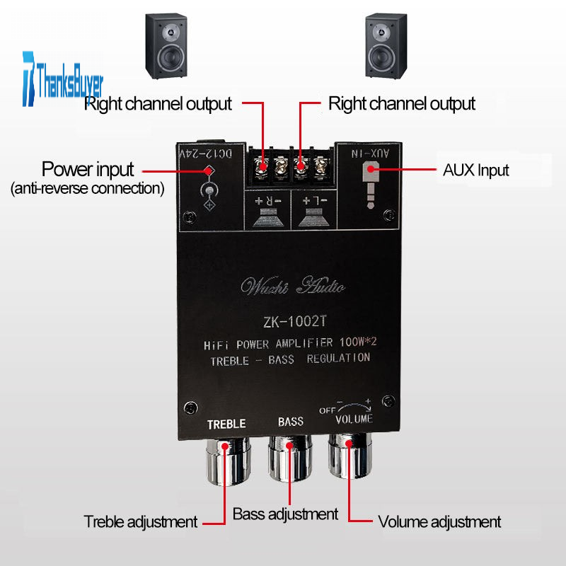 Note when adjusting treble and bass: when the treble or bass right rotation is adjusted to the maximum, if the sound is distorted, it means that the treble or bass  gain is too large. It is necessary to turn the treble or bass potentiometer to the left to reduce the gain or turn the VOLUME potentiometer to the left to reduce the total volume.