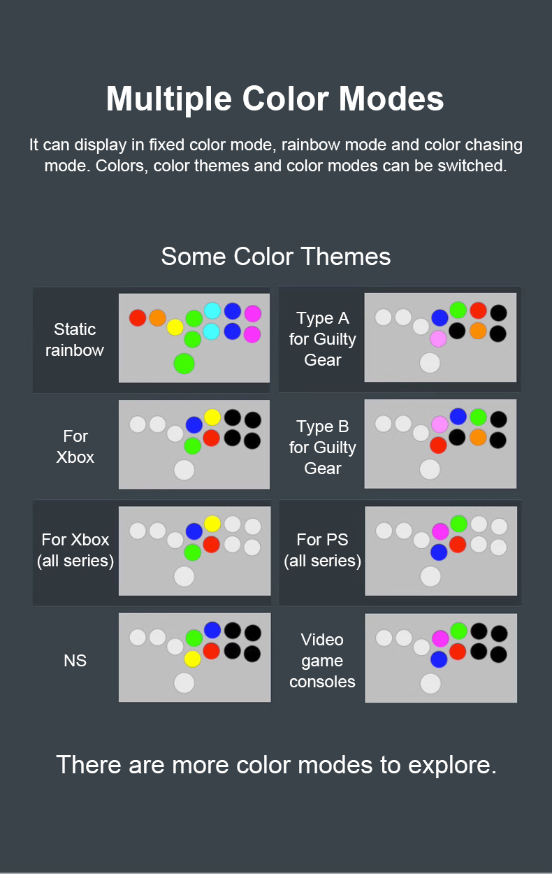 * It can display in fixed color mode, rainbow mode and color chasing mode. Colors, color themes and color modes can be switched