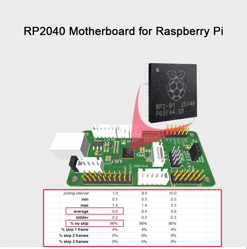 - This version adopts RP2040 motherboard for Raspberry Pi: Dual-core processor for ARM Cortex M0+, up to 133MHz operating frequency, 0.8ms delay, no frameskip rate reaching 96% and 4% within 1fps.
