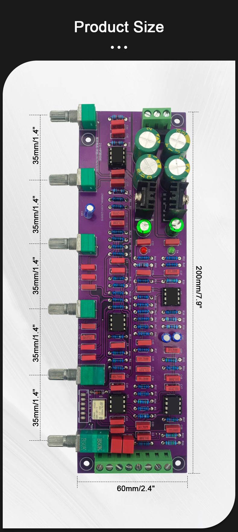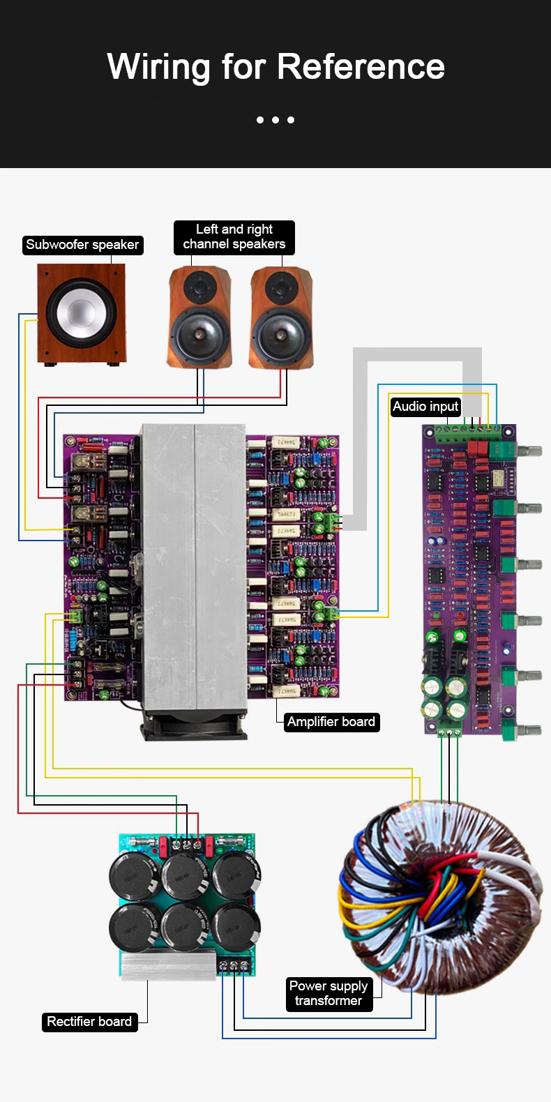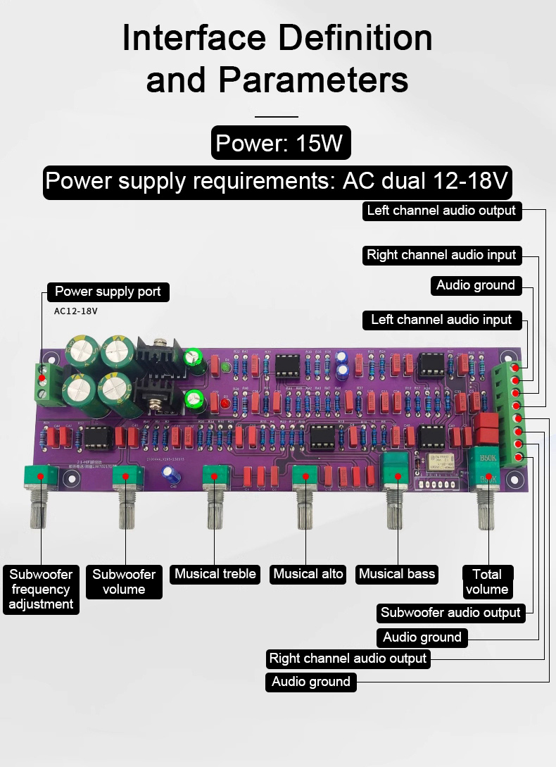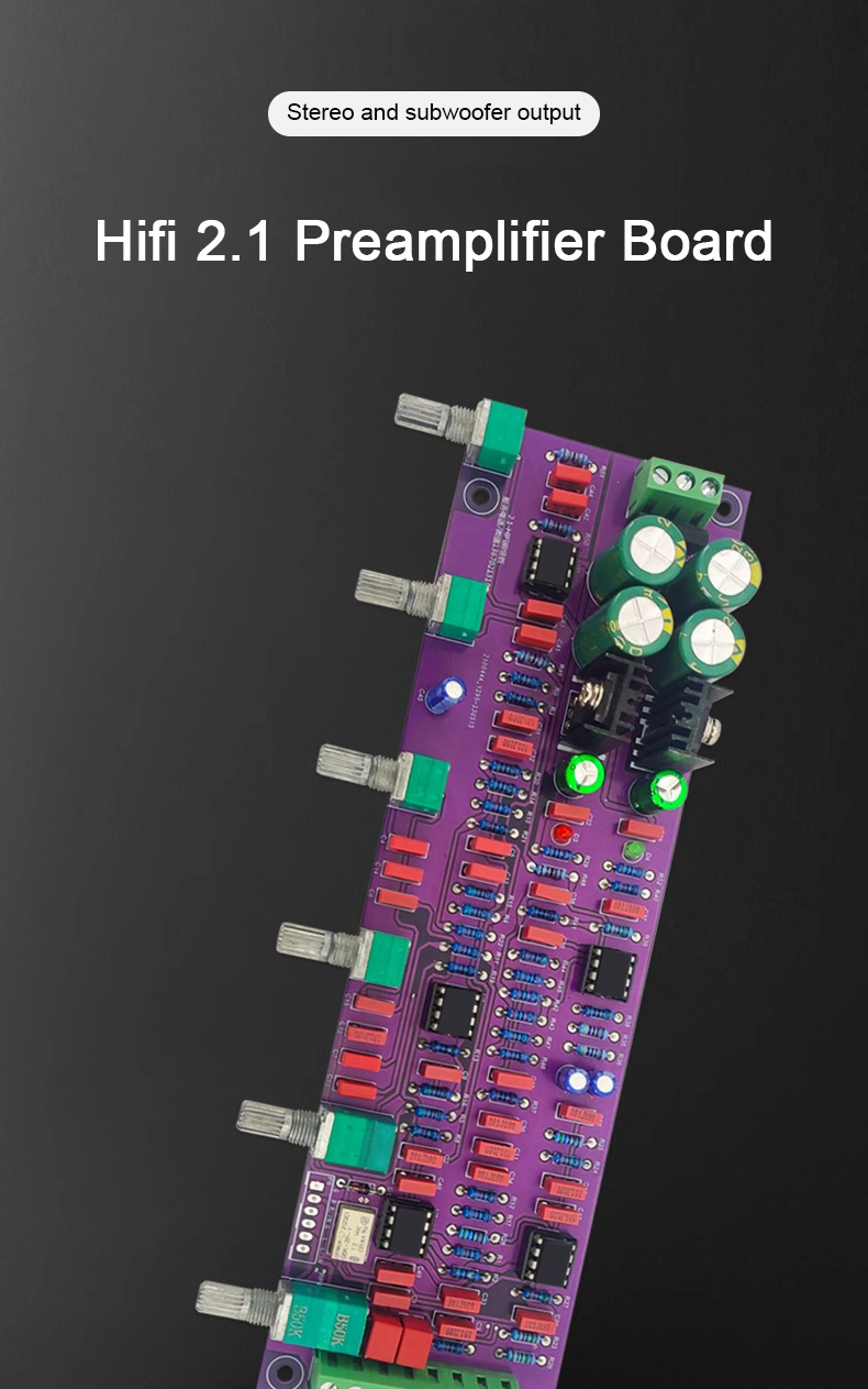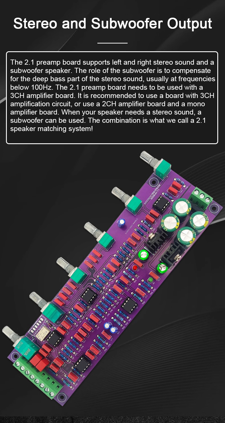 - Stereo and subwoofer output: The 2.1 preamp board supports left and right stereo sound and a subwoofer speaker. The role of the subwoofer is to compensate for the deep bass part of the stereo sound, usually at frequencies below 100Hz. The 2.1 preamp board needs to be used with a 3CH amplifier board. It is recommended to use a board with 3CH amplification circuit, or use a 2CH amplifier board and a mono amplifier board. When your speaker needs a stereo sound, a subwoofer can be used. The combination is what we call a 2.1 speaker matching system