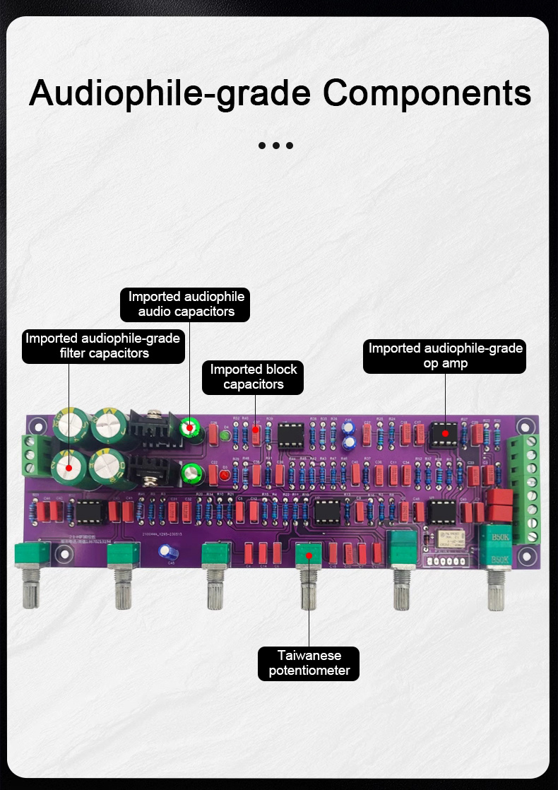 - Audiophile-grade components: Imported audiophile-grade filter capacitors, audio capacitors, block capacitors, op amp and Taiwanese potentiometer