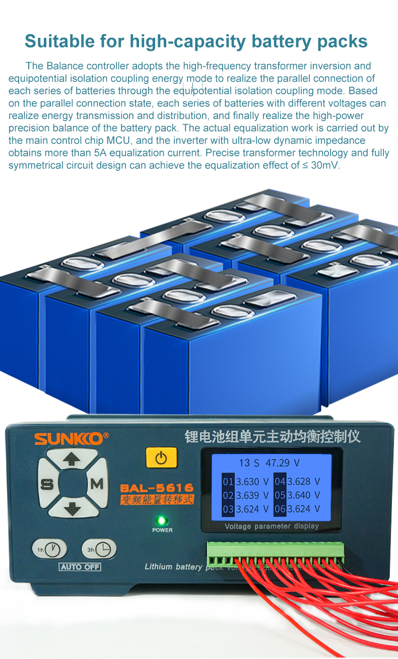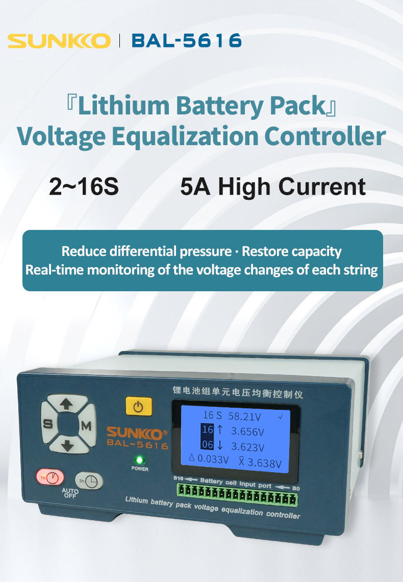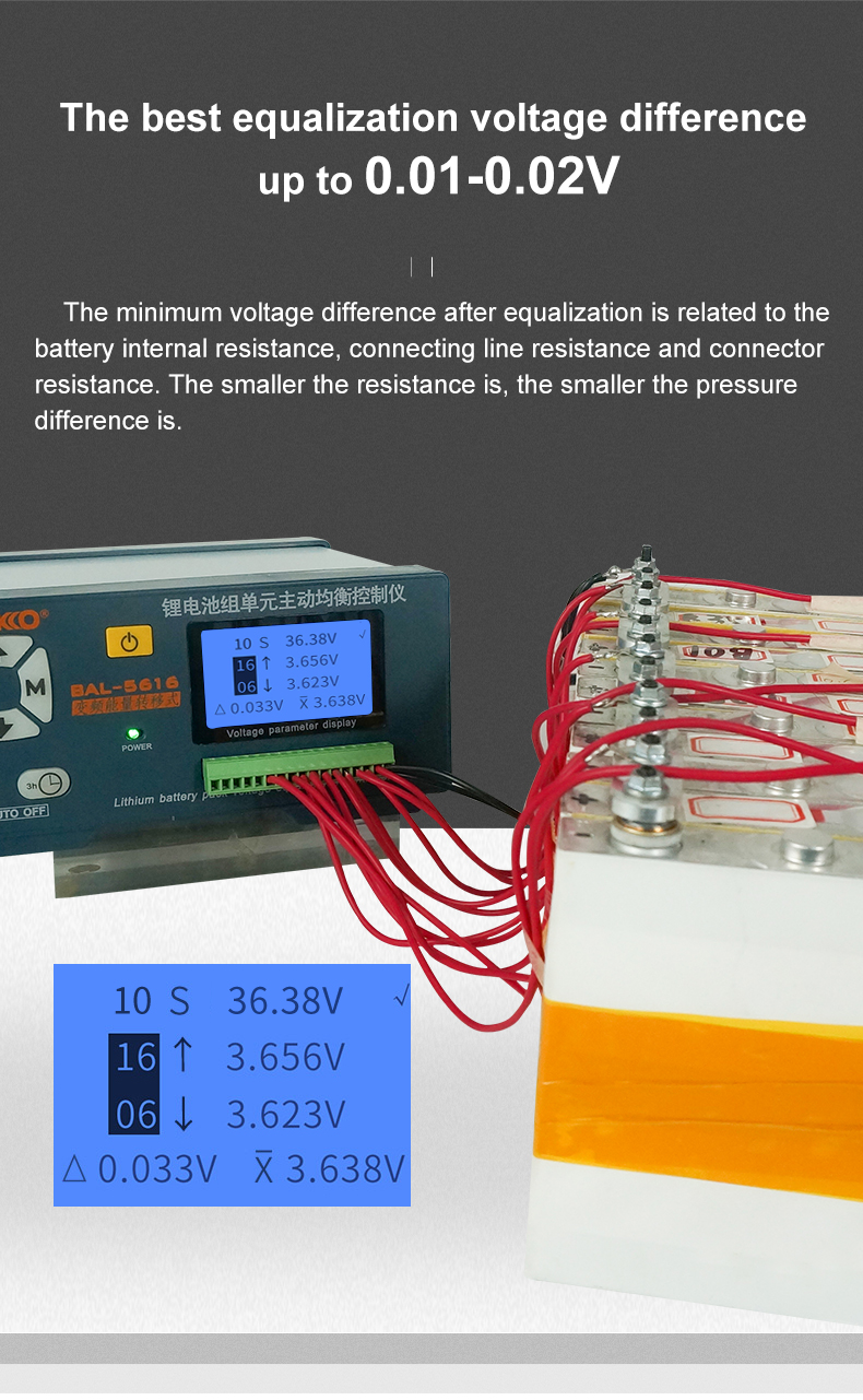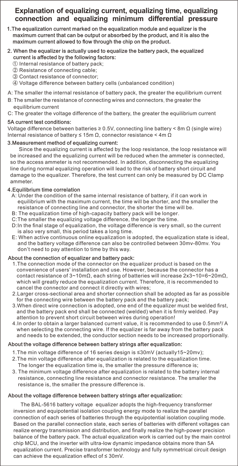 - BAL-5616 equalizer controller adopts high-frequency transformer inversion and equipotential isolation coupling energy technology to realize the parallel connection of each series of batteries through equipotential isolation coupling. Based on the parallel connection state, each series of batteries with different high and low voltages realize energy transmission and distribution, and finally realize the high-efficiency and precise balance of the battery pack. The Taiwan main control chip MCU combines with the ultra-low dynamic impedance inverter to obtain the more than 5A balanced current. The precise transformer process and fully symmetrical circuit design can achieve the balanced effect of≤30mV.