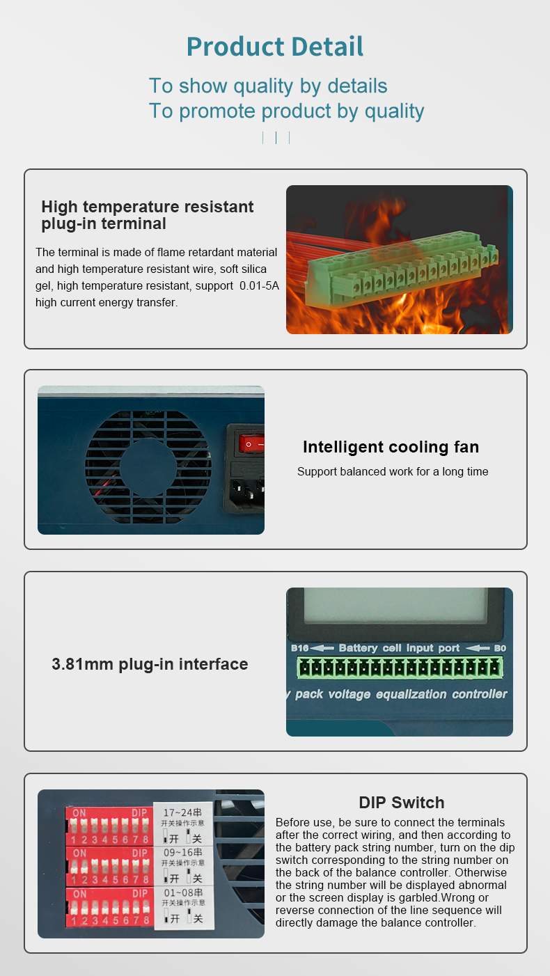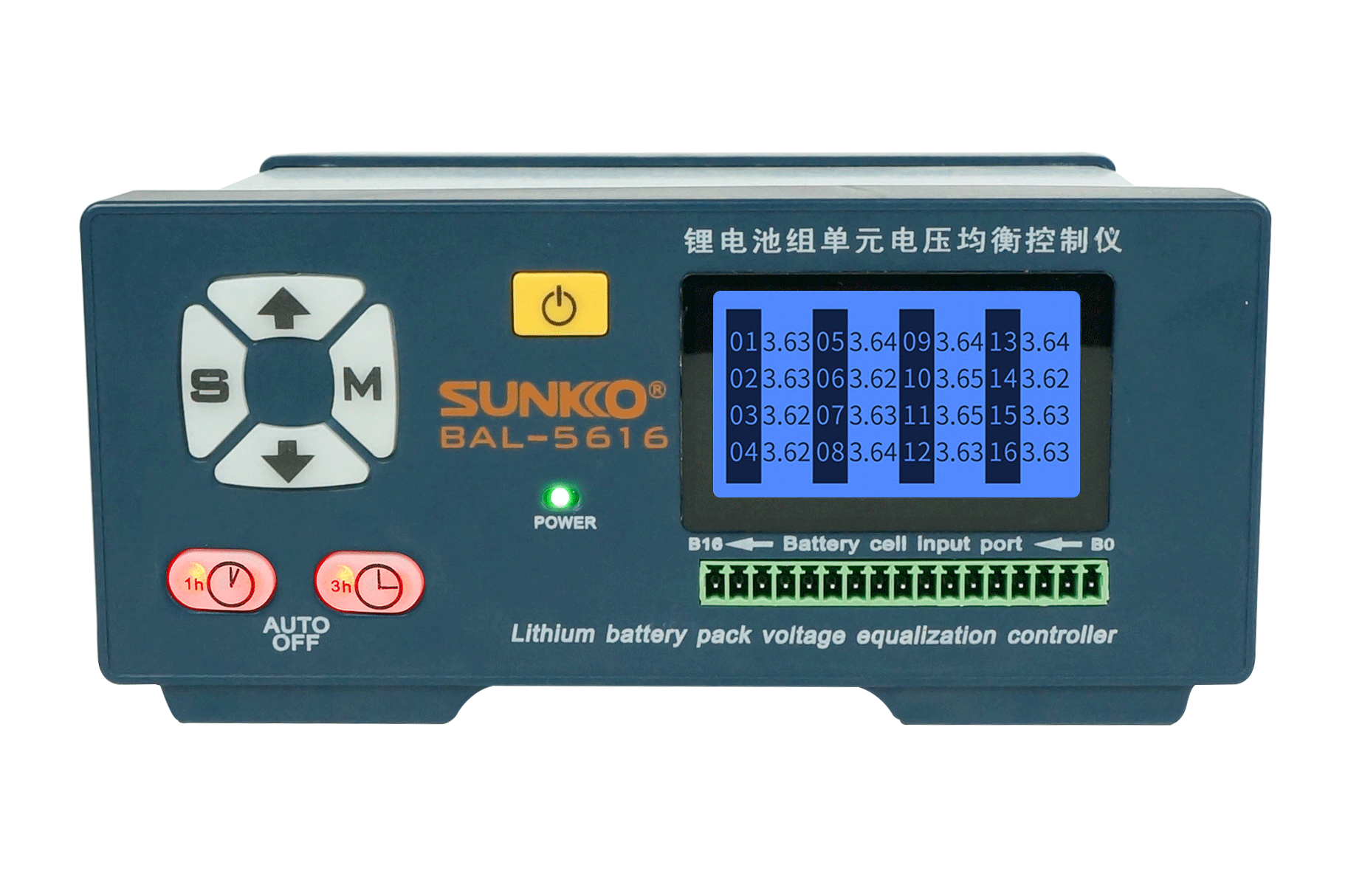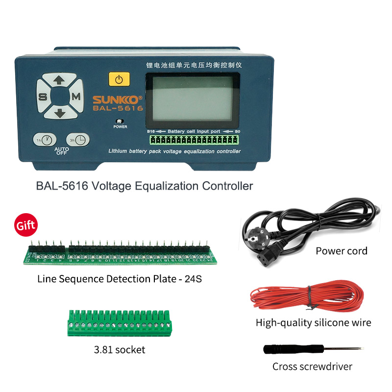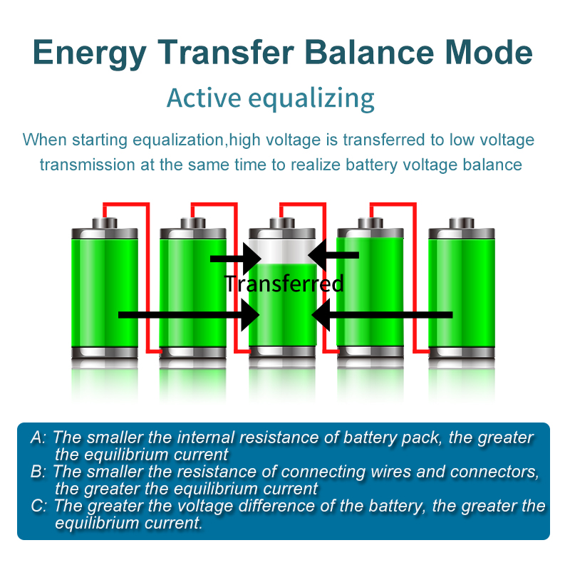 - BAL-5616 equalizer controller adopts high-frequency transformer inversion and equipotential isolation coupling energy technology to realize the parallel connection of each series of batteries through equipotential isolation coupling. Based on the parallel connection state, each series of batteries with different high and low voltages realize energy transmission and distribution, and finally realize the high-efficiency and precise balance of the battery pack. The Taiwan main control chip MCU combines with the ultra-low dynamic impedance inverter to obtain the more than 5A balanced current. The precise transformer process and fully symmetrical circuit design can achieve the balanced effect of≤30mV.