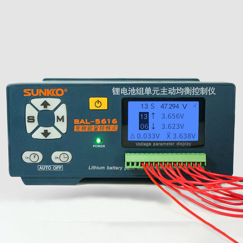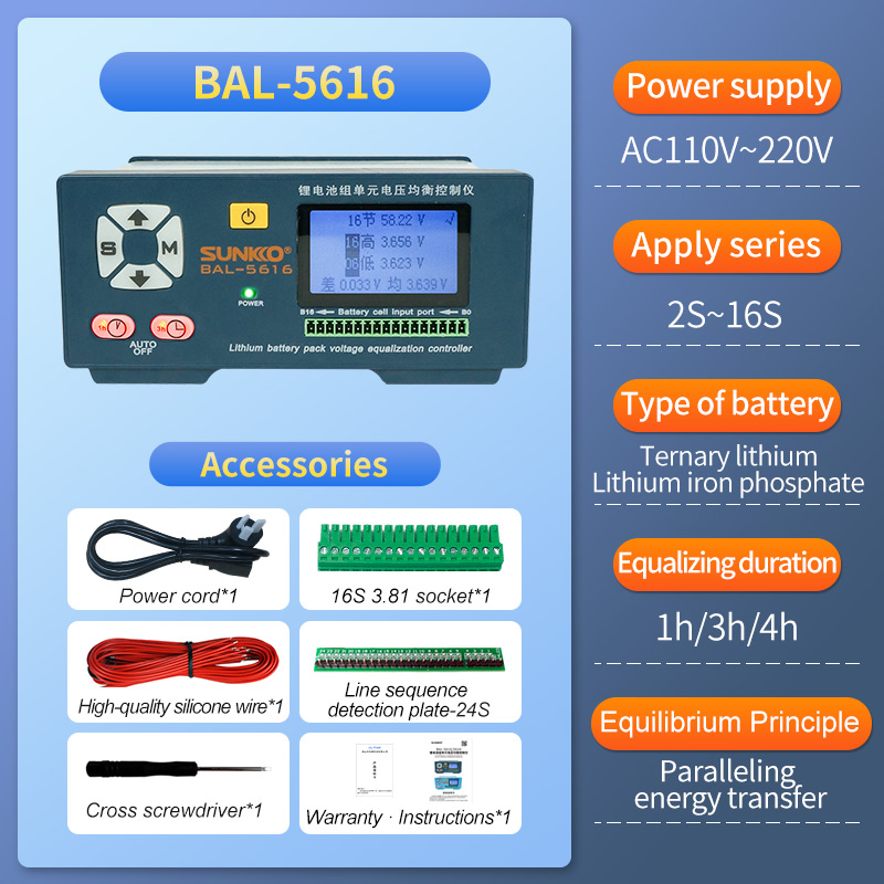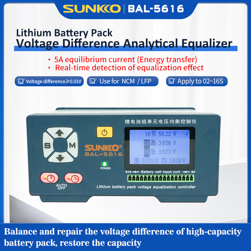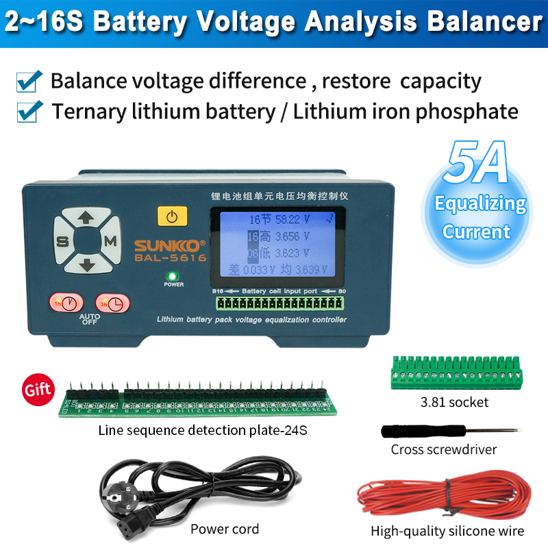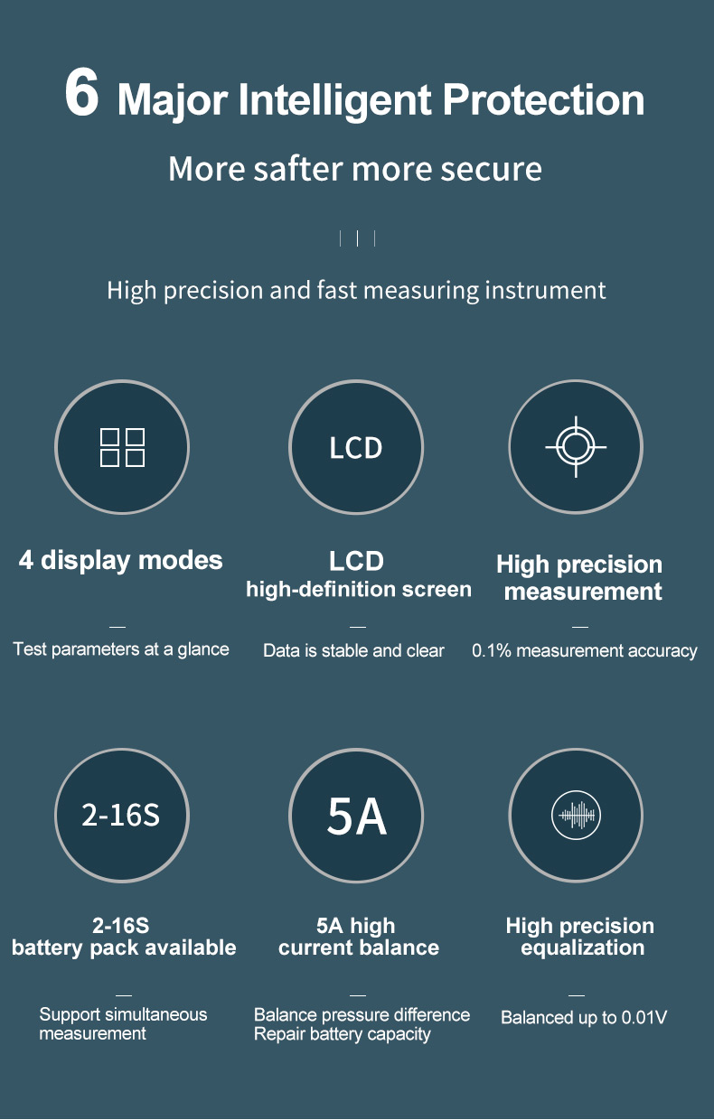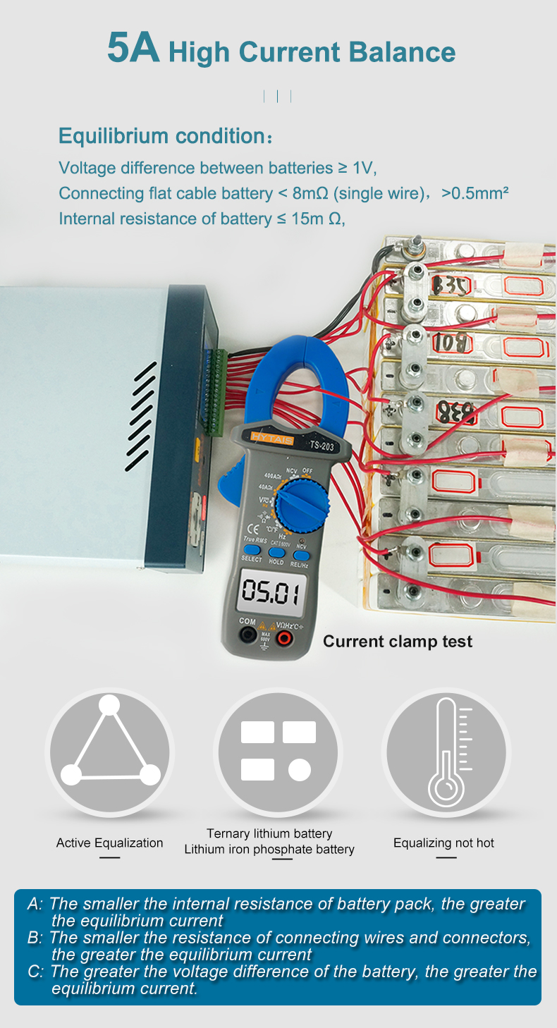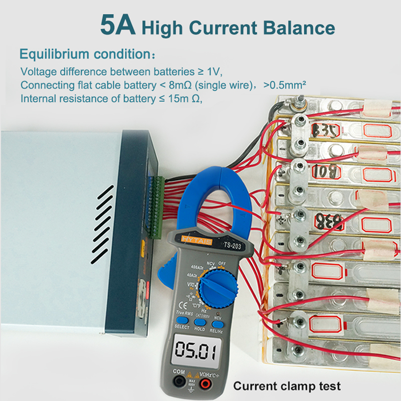 - And the analyzer adopts latest large-scale high-speed MCU chip of American microchip to carry out real-time precision detection of each unit of lithium battery pack. The voltage information collected by the chip is stored and calculated and compared, and the data is processed and displayed on the LCD screen. This detector can detect the voltage of up to 16 series of lithium batteries at the same time, and automatically analyze and compare the voltage. Real-time monitoring equalizing voltage It is suitable for high-capacity ternary lithium battery pack and lithium iron phosphate battery pack, etc. The maximum equalizing current can reach 5A, and the equalizing voltage difference can reach 30mV; Forced start switch is added to better solve the problem of poor equalization effect.