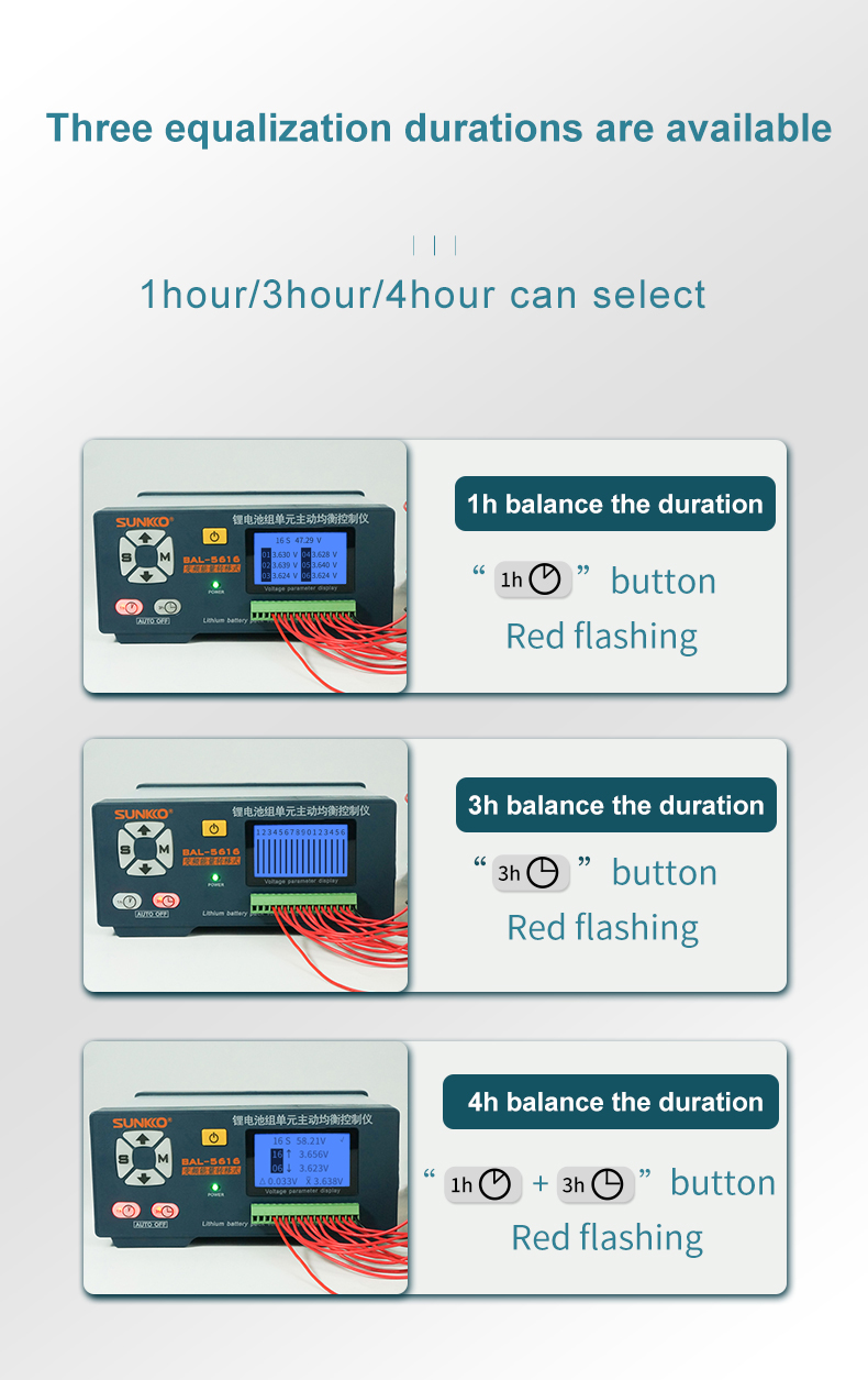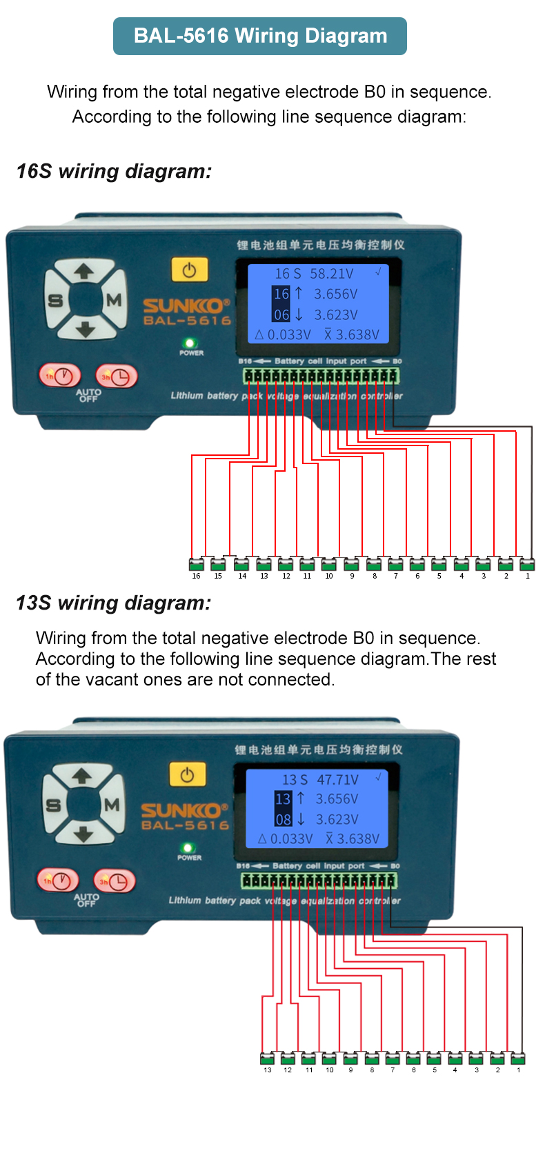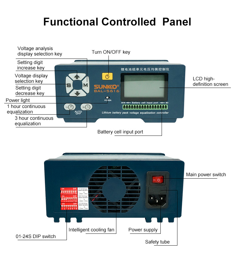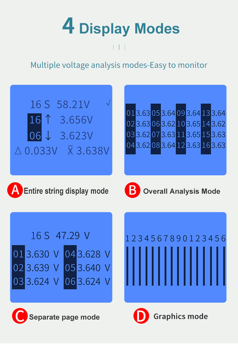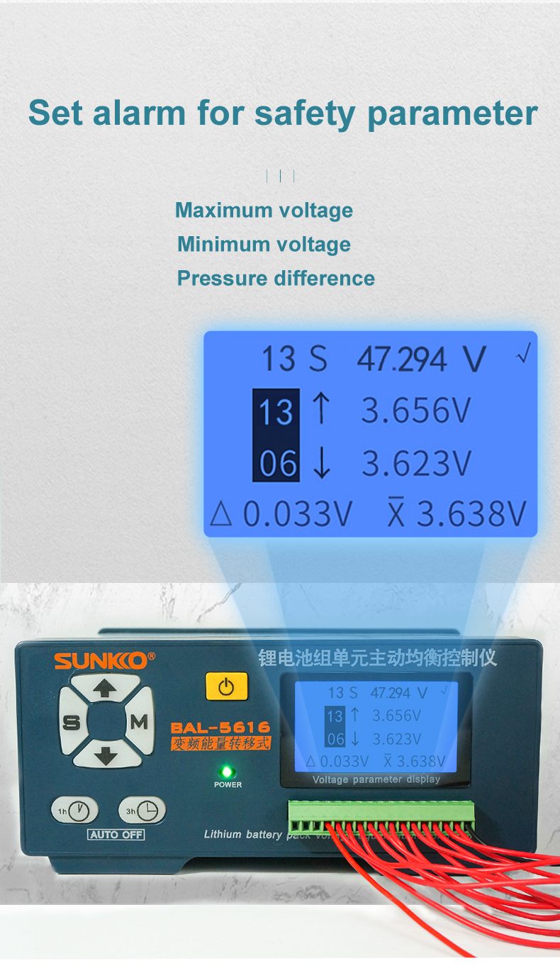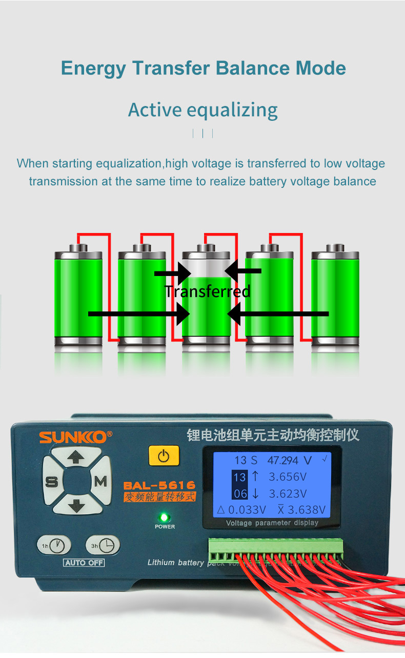 - And the analyzer adopts latest large-scale high-speed MCU chip of American microchip to carry out real-time precision detection of each unit of lithium battery pack. The voltage information collected by the chip is stored and calculated and compared, and the data is processed and displayed on the LCD screen. This detector can detect the voltage of up to 16 series of lithium batteries at the same time, and automatically analyze and compare the voltage. Real-time monitoring equalizing voltage It is suitable for high-capacity ternary lithium battery pack and lithium iron phosphate battery pack, etc. The maximum equalizing current can reach 5A, and the equalizing voltage difference can reach 30mV; Forced start switch is added to better solve the problem of poor equalization effect.