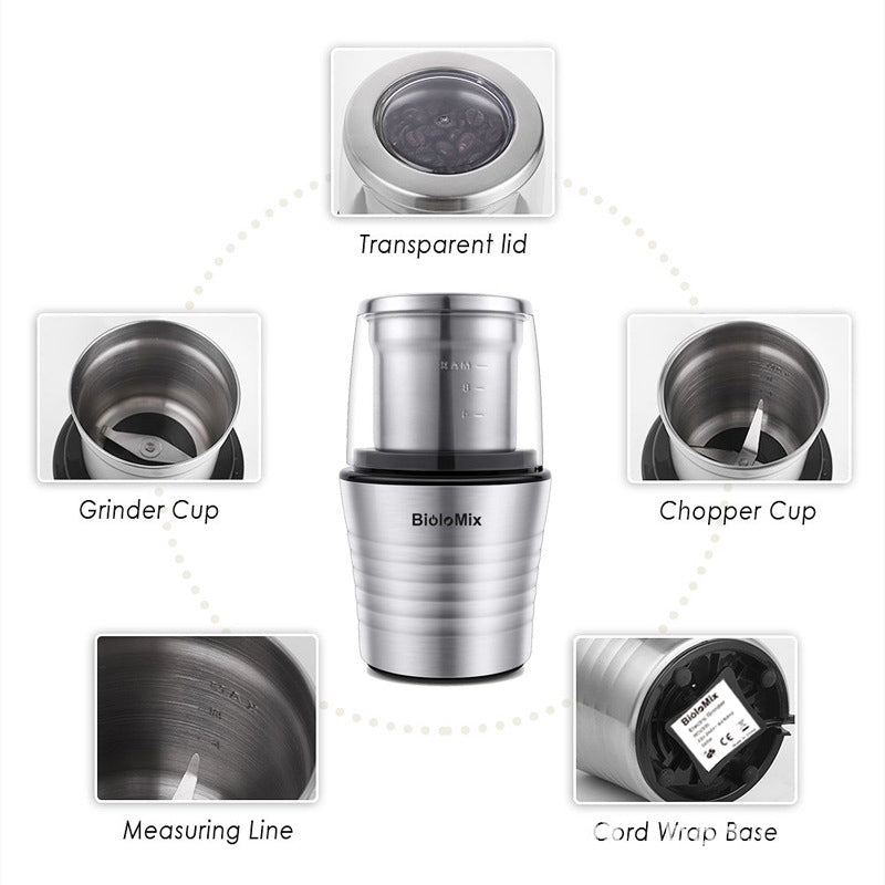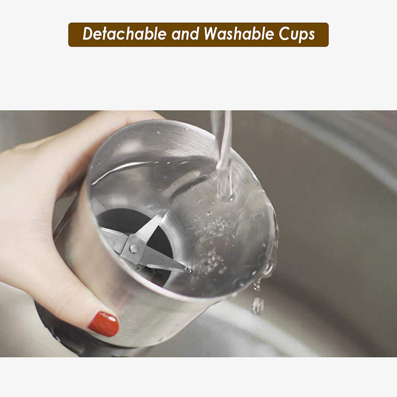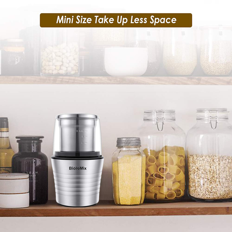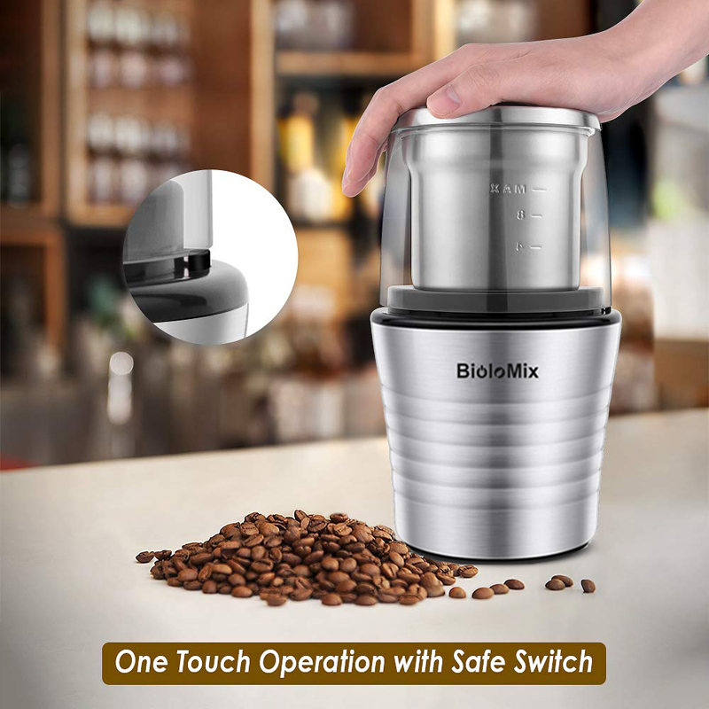 2. AMAZING VALUE & VERSATILE USAGE: An incredible coffee bean grinder machine that comes with 2 Removable Cups (up to 12 cups of coffee), unlike standard food grinder that can only grind one kind of ingredient. Our Biolomix electric coffee grinder can perfectly mill and grind dry or moist ingredients in a snap, like coffee beans, nuts, spice, herbs, pepper, sugar, salt, dried fruits, linseed's, soybeans, lentils, garlic, shallot, ginger and more.