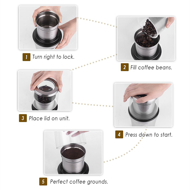3. CHOOSE YOUR COARSENESS: With sharp cutting stainless steel blades, which can efficiently whirl and chop the coffee beans into consistently sized particles and quickly ground up a full load of beans into ultra-fine powder in 25 seconds. The longer the beans are ground, the finer they will naturally be.